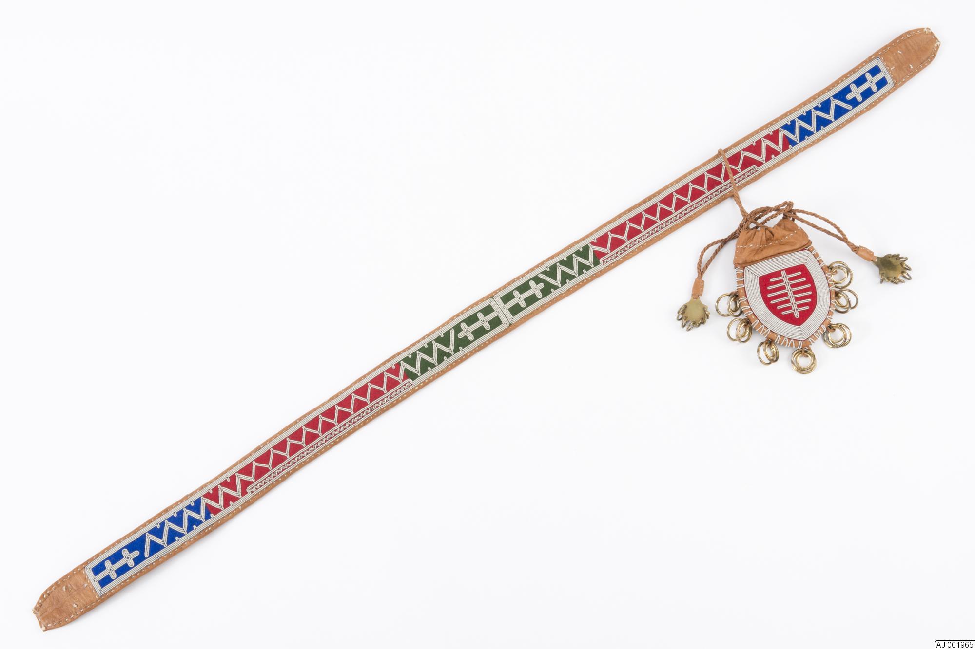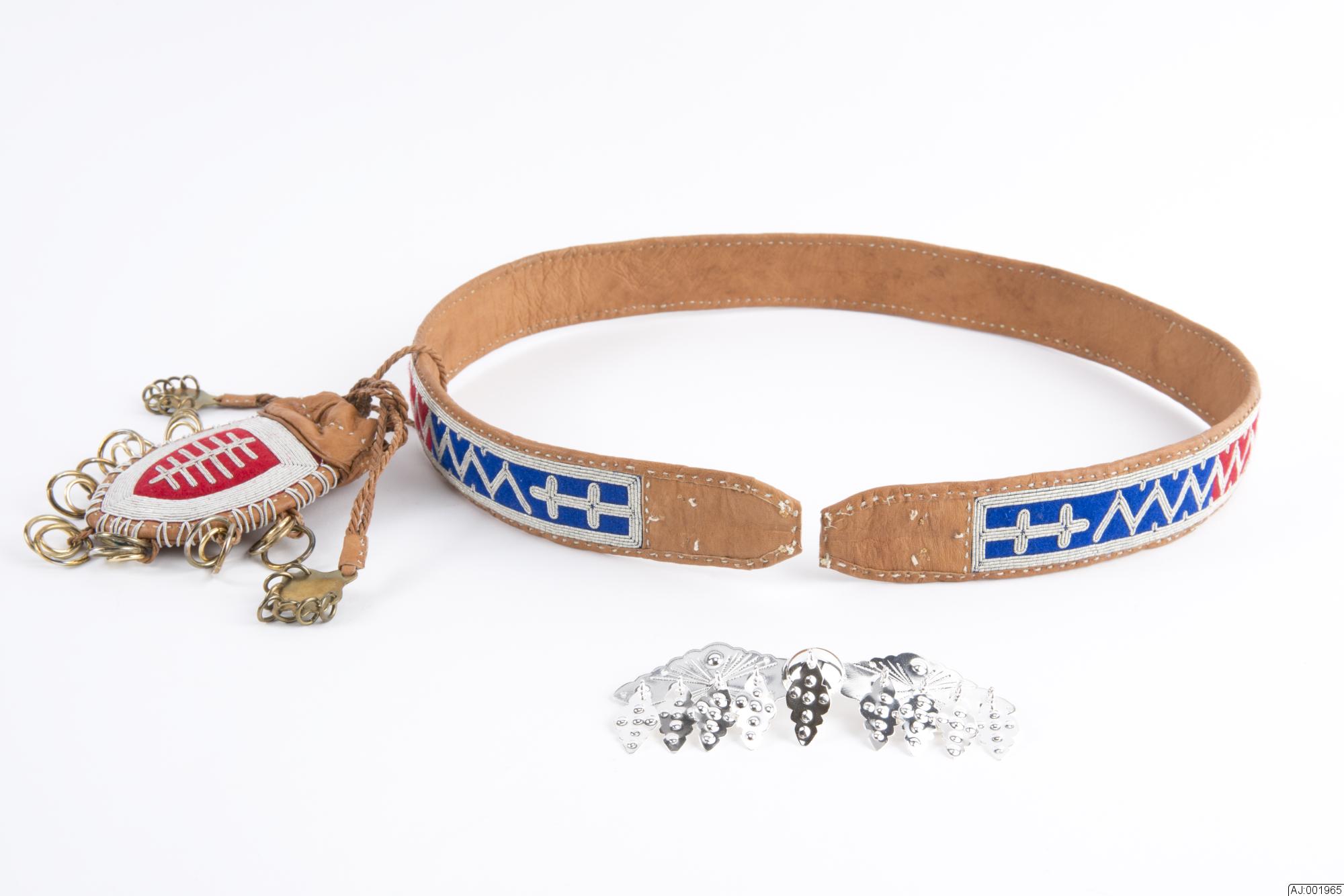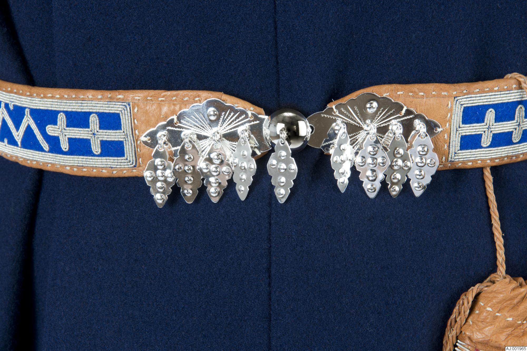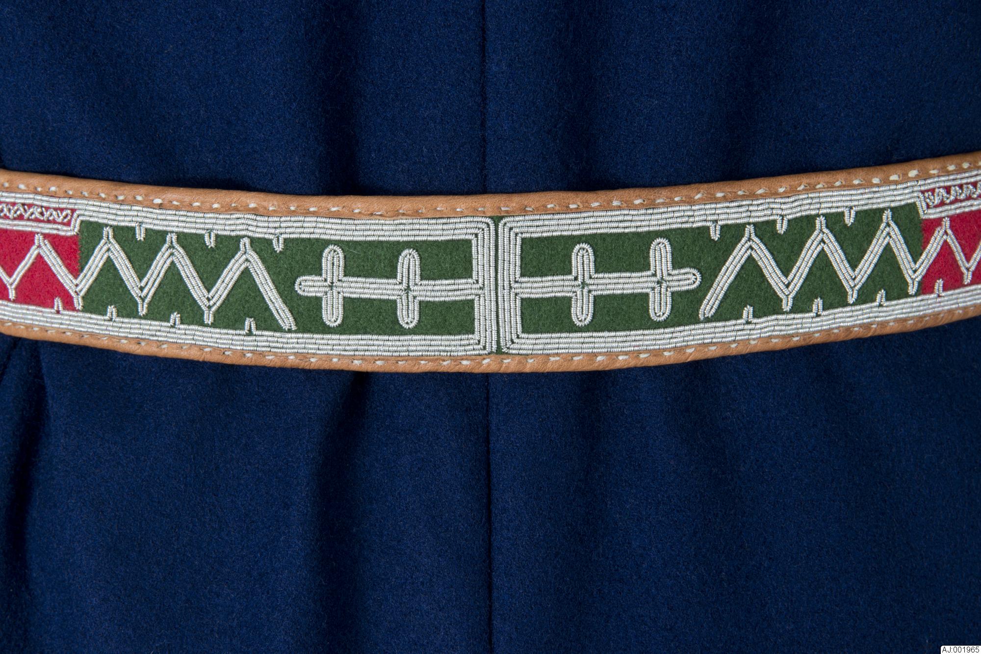 AJ 1965 tenntrådsbroderat bälte av kläde och barkgarvat renskinn. Broderiet är gjort på klädet, som har färgerna: blått, rött, grönt. Ytterst på bältet är blåa färger, sedan rött, och längst bak grönt. Baksidan och ändarna av barkgarvat renskinn. Silverspännet är tillverkat av Kvenangen Silba Sisti.
