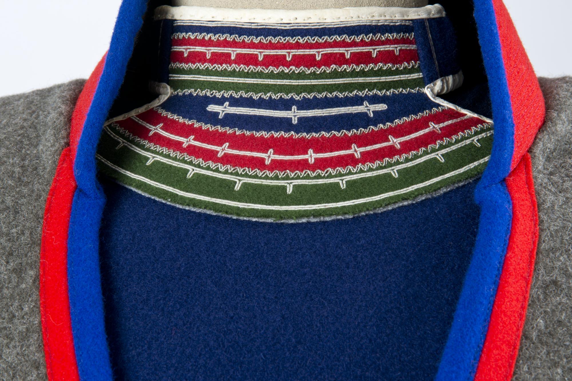 - Barmkläde, mans med bröststycket i mörkt kläde. Halsremmen har skinnskoning och är applikerad framtill med grönt, blått och rött kläde. Den halvmåneformade "spegeln", leahta, är sammansatt med kläde i olika färger och broderade med tenntråd.