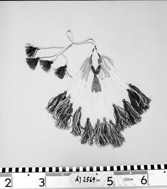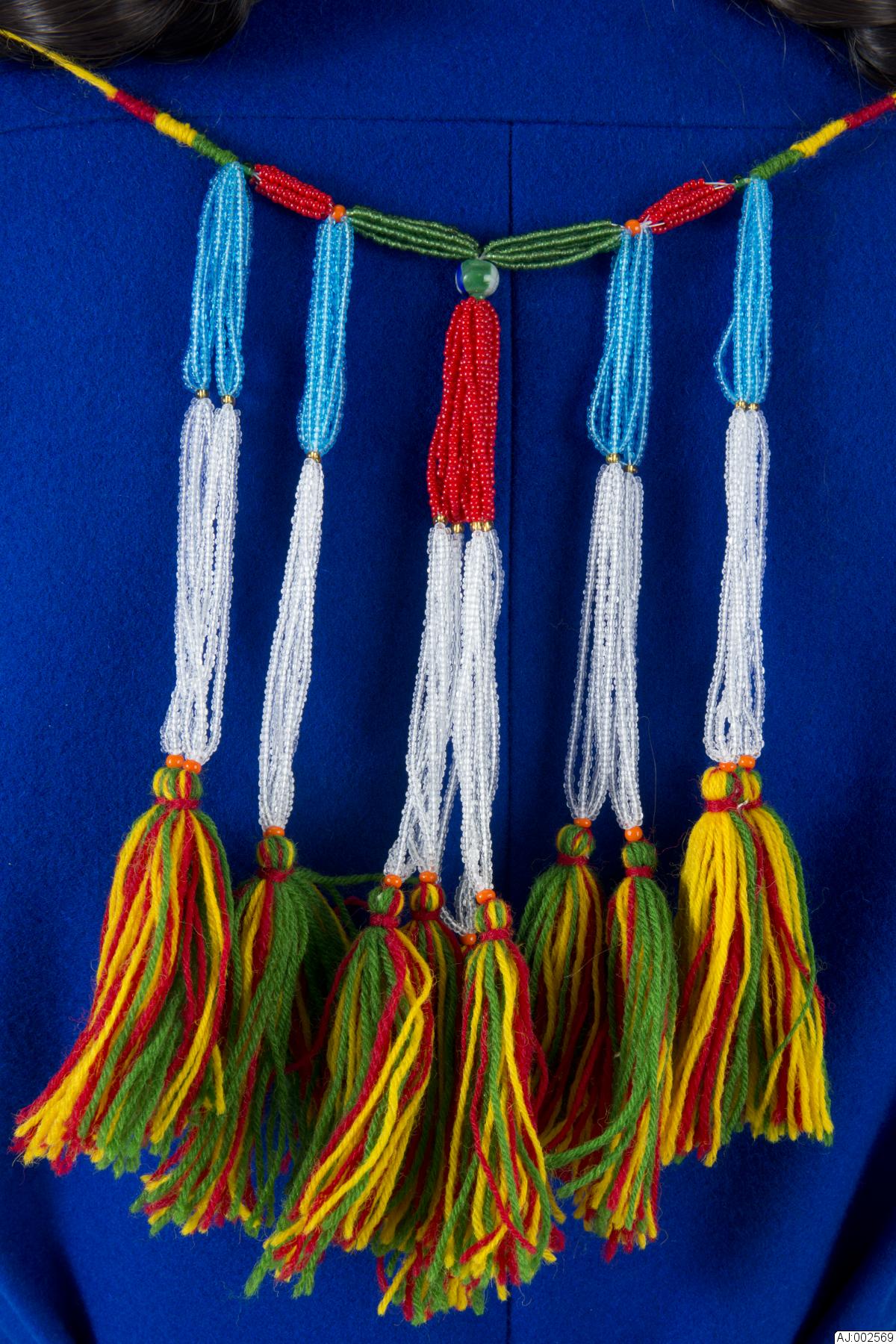 Sydsamisk hårprydnad för kvinna, baarkaldahke. Hårband av flätat gult ullgarn att knyta i håret/hårflätor omlindade med rött, gult och grönt ullgarn och med påträdda pärlor i rött och grönt. Från hårbandet hänger 6 dubbla snoddar ned med påträdda pärlor i blått och genomskinligt vitt och i varje ände tofsar av rött, gult och grönt ullgarn.