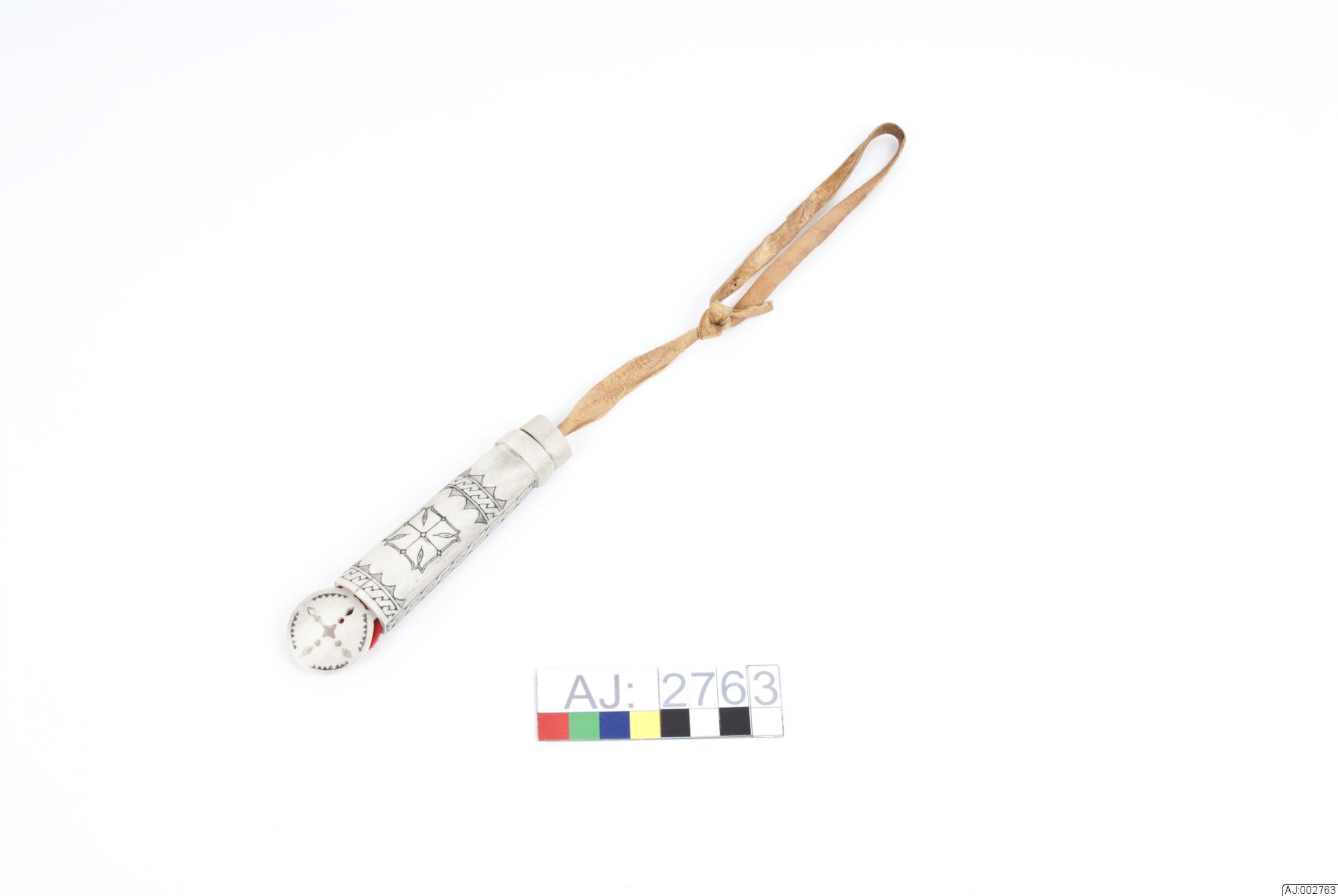 Överst en skinnremsa med ögla samt, nedanför öglan en "stopp" av horn.