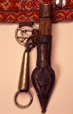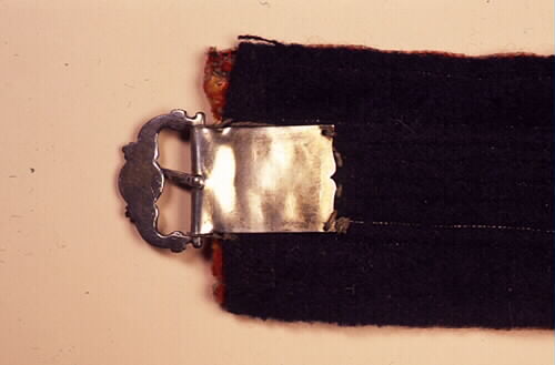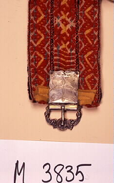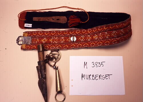 Vävt kvinnobälte i nordsamisk modell. Bältet består av 3 vävda våder som är ihopsydda, som foder är det blått vadmal eller blått tjockt kläde. Bottenfärgen är vit och gul, kantfärg är röd och svart. Mönstertrådarna är dominerande rött men några trådar är turkosa. För fäste är det ett silverspänne i ena änden. Spännet är ornerat, längd 6,5, bredd 4,2 cm. Som mothake är det på baksidan av bältet på andra änden fastsytt en skinnbit med 4 hål gjorda. I samma ände är det på rätsidan fäst ett tennbeslag, 4-kantigt med tretornsmotiv. En 4-fläts snodd i rött och gult garn med tofs i rött, gult och blått hänger på samma sida. Ett rund, platt silverbeslag med larvornament, diam 2,1 cm är fäst en bit in på bältet. I bältet är det med en skinnbit fäst ett mässingsgehäng. Gehänget har en djurfigur utskuren (löpande hund) och är i diam 4,8 cm. I gehänget är det fäst en tvinnad skinnsnodd. I den hänger ett mässingsnålhus och en kniv. Ovanför nålhuset är det en hemgjord tennkula. Nålhuset har skinn inuti för fäste av nålarna och en stor mässingsring i ändan, diam 4 cm. I samma skinnsnodd är det fäste en kniv. Kniven består av trä och ornamenterad mässing och skälva kniveggen i stål. Knivslidan består av delvis ornamenterad mässing, trä och skinn. Kniven är 22,5 cm lång och 5 cm bred.
