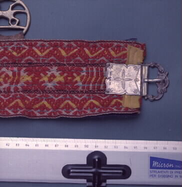 Vävt kvinnobälte i nordsamisk modell. Bältet består av 3 vävda våder som är ihopsydda, som foder är det blått vadmal eller blått tjockt kläde. Bottenfärgen är vit och gul, kantfärg är röd och svart. Mönstertrådarna är dominerande rött men några trådar är turkosa. För fäste är det ett silverspänne i ena änden. Spännet är ornerat, längd 6,5, bredd 4,2 cm. Som mothake är det på baksidan av bältet på andra änden fastsytt en skinnbit med 4 hål gjorda. I samma ände är det på rätsidan fäst ett tennbeslag, 4-kantigt med tretornsmotiv. En 4-fläts snodd i rött och gult garn med tofs i rött, gult och blått hänger på samma sida. Ett rund, platt silverbeslag med larvornament, diam 2,1 cm är fäst en bit in på bältet. I bältet är det med en skinnbit fäst ett mässingsgehäng. Gehänget har en djurfigur utskuren (löpande hund) och är i diam 4,8 cm. I gehänget är det fäst en tvinnad skinnsnodd. I den hänger ett mässingsnålhus och en kniv. Ovanför nålhuset är det en hemgjord tennkula. Nålhuset har skinn inuti för fäste av nålarna och en stor mässingsring i ändan, diam 4 cm. I samma skinnsnodd är det fäste en kniv. Kniven består av trä och ornamenterad mässing och skälva kniveggen i stål. Knivslidan består av delvis ornamenterad mässing, trä och skinn. Kniven är 22,5 cm lång och 5 cm bred.