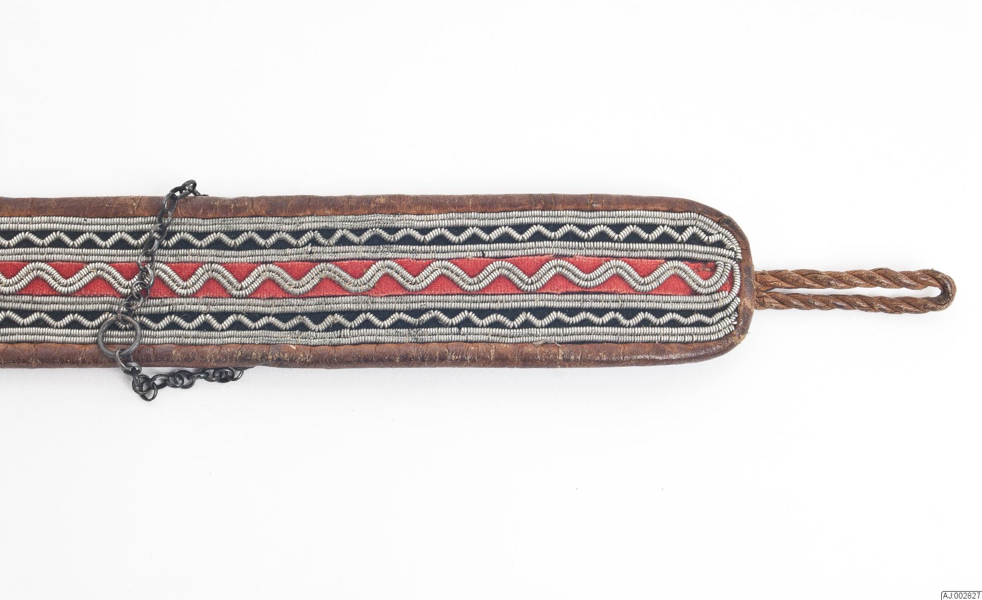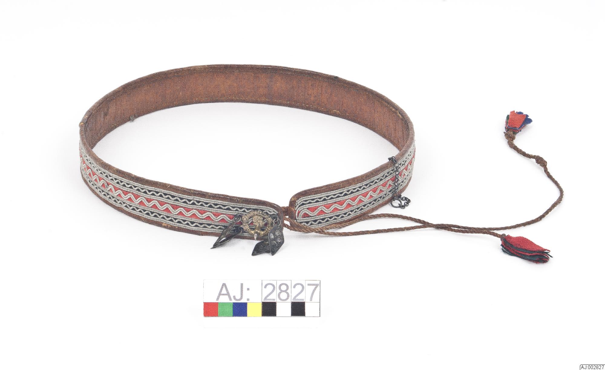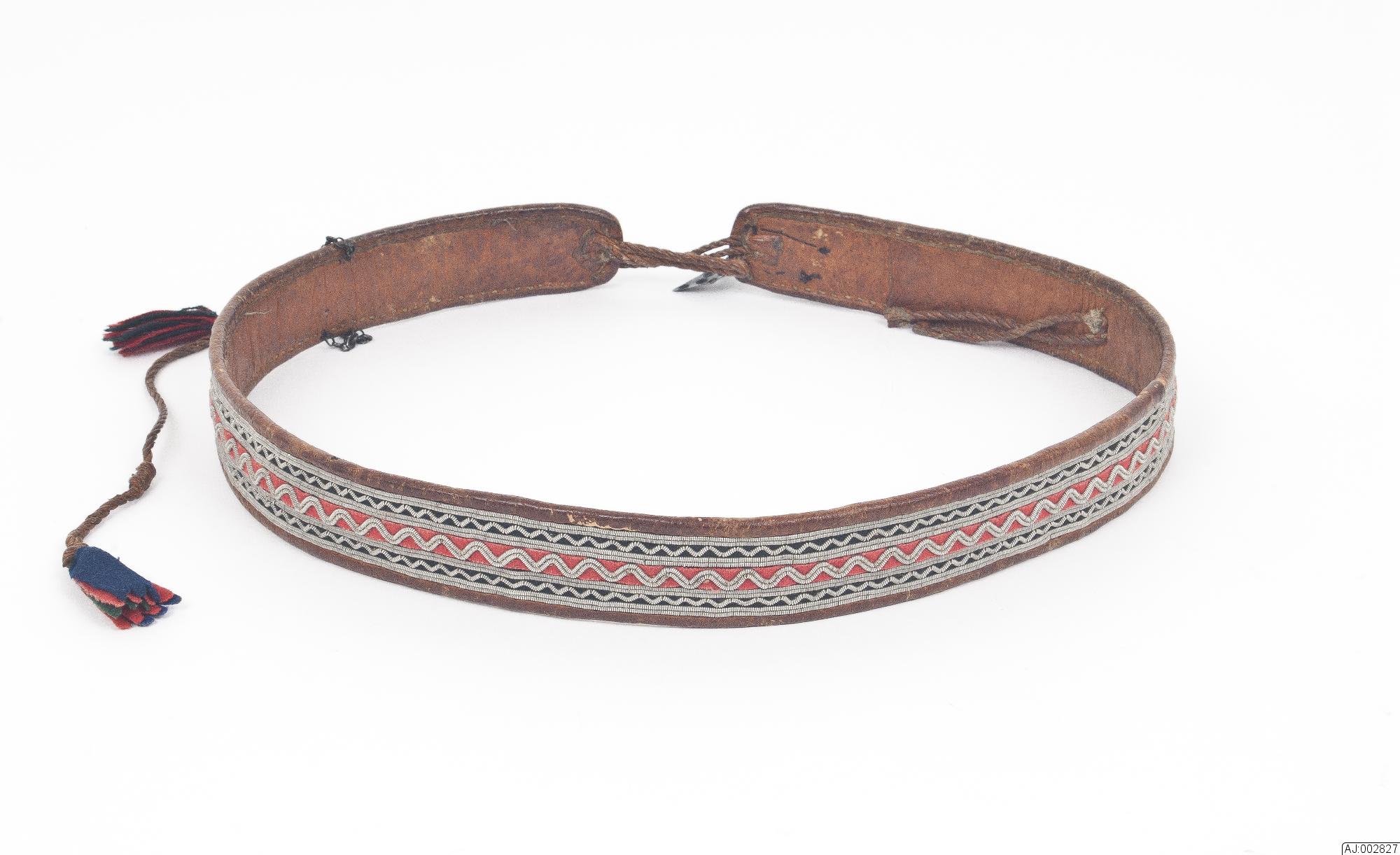 Bälte som används i sydsamiskt område av kvinnor. Tennbroderat på röd och svart klädesbotten. Kantad och fodrad med garvat renskinn som är fäst med sentråd. För fästning är det 2 tvinnade skinnsnoddar som är avslutade med klädestofsar fäst i ena änden. I samma ände är det (en bit in) fäst en kedja i silver?. I ena änden ett silverspänne med 4 löv.