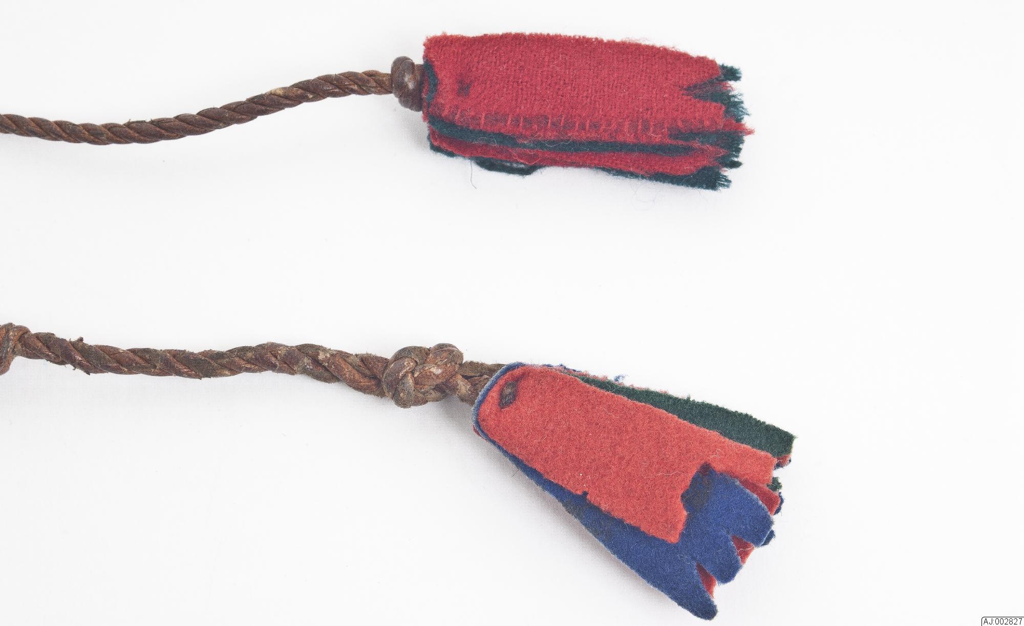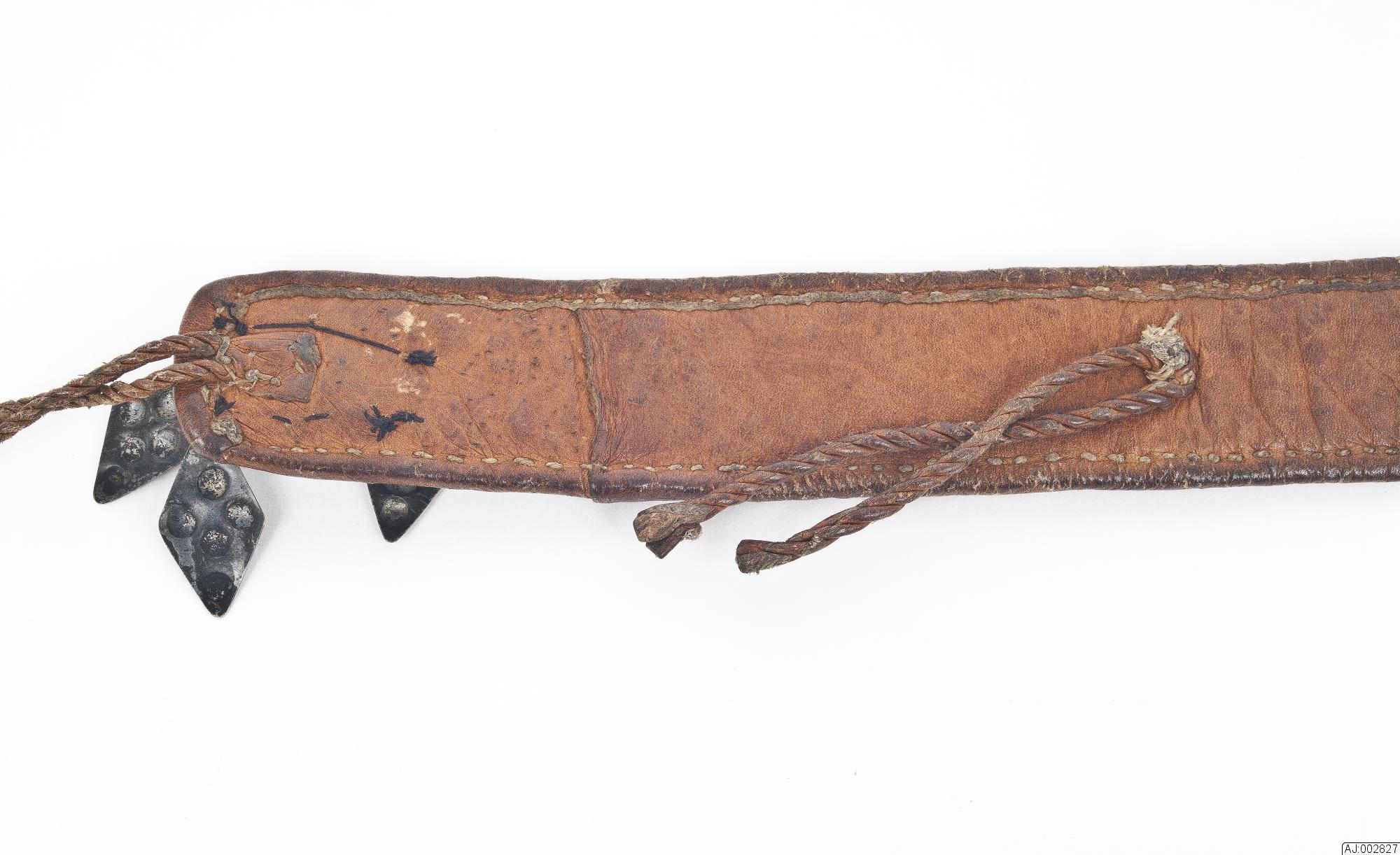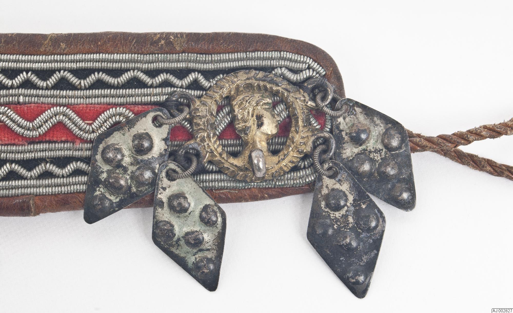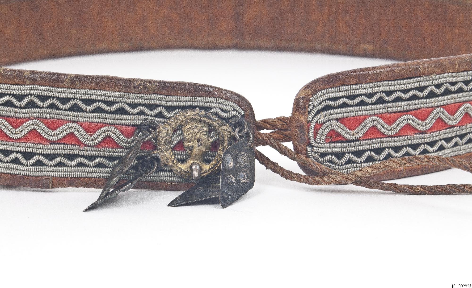 Bälte som används i sydsamiskt område av kvinnor. Tennbroderat på röd och svart klädesbotten. Kantad och fodrad med garvat renskinn som är fäst med sentråd. För fästning är det 2 tvinnade skinnsnoddar som är avslutade med klädestofsar fäst i ena änden. I samma ände är det (en bit in) fäst en kedja i silver?. I ena änden ett silverspänne med 4 löv.