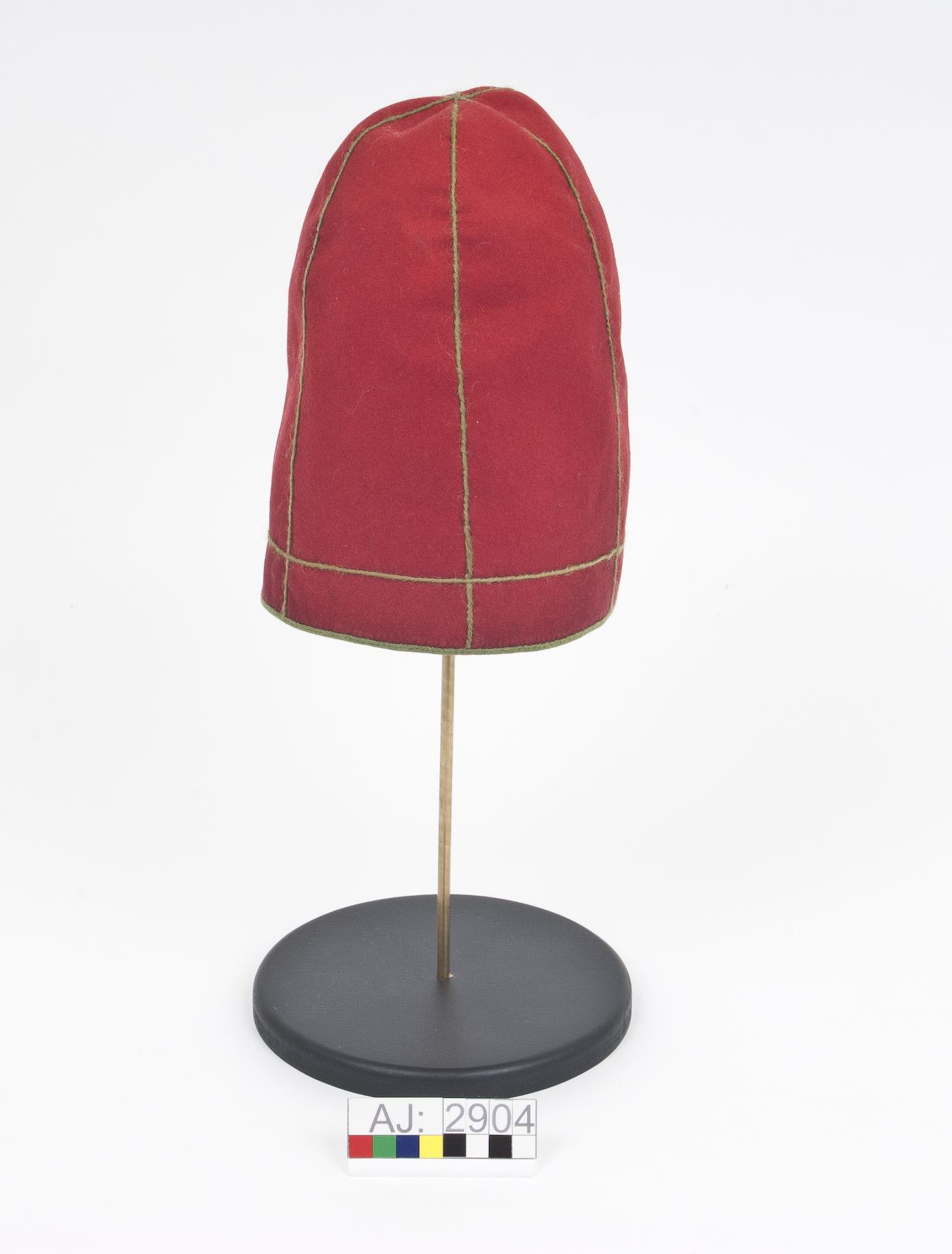 Kvinnomössa i rött, tunt kläde. 6 kilar som är för hand ihopsydda. Ovanpå sömmarna, på rätsidan, är det sytt en grön dekorationstråd i garn. Nederst är mössan kantad med grönt kläde. En dekorationsrand är sydd 3 cm ovanför nederkanten.