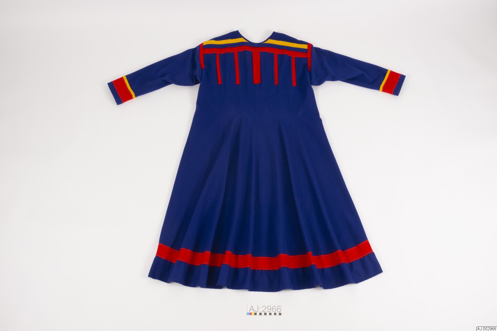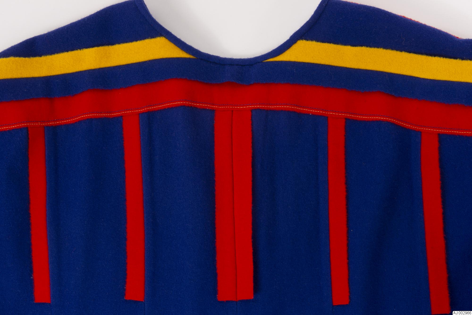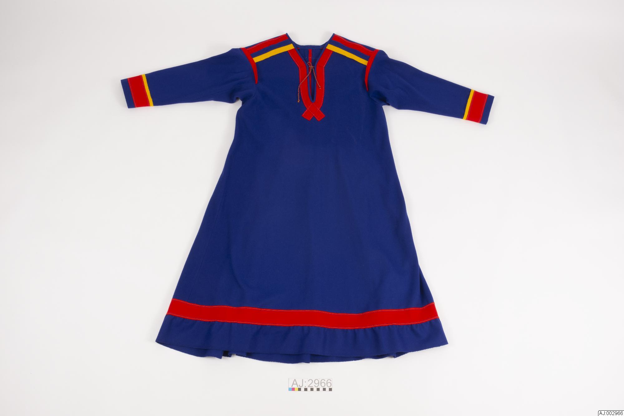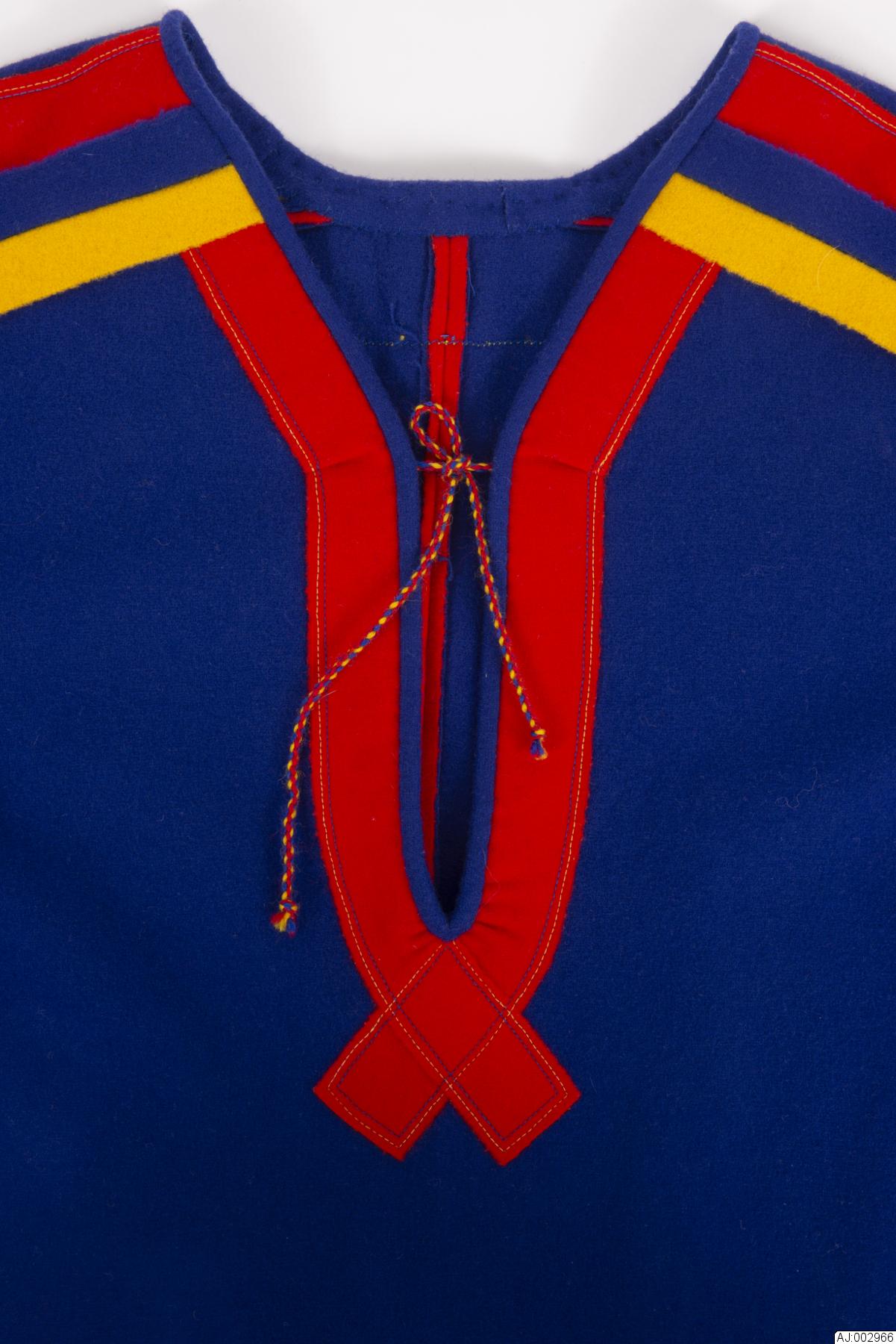 Klarblå kvinnokolt. I halsen 4-flätade garnsnoddar på var sida för att knyta ihop barmen.