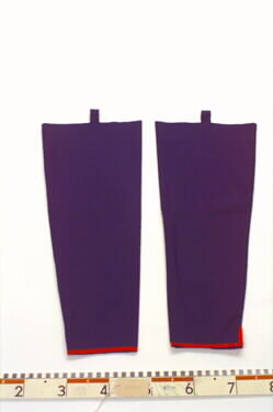 AJ:2968:1 benholk, 2 benholk. Blåa holkar i kläde med röd kantning nertill. En hake längst upp på var ben.