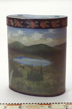 Träkont i spåntat trä med lock i trä. Målad utsida med naturmotiv. Konten var fylld med tygbitar. Nyckel saknas. Kistan är målad, ej på undersidan. Locket har motiv AJ 3034:1-22.