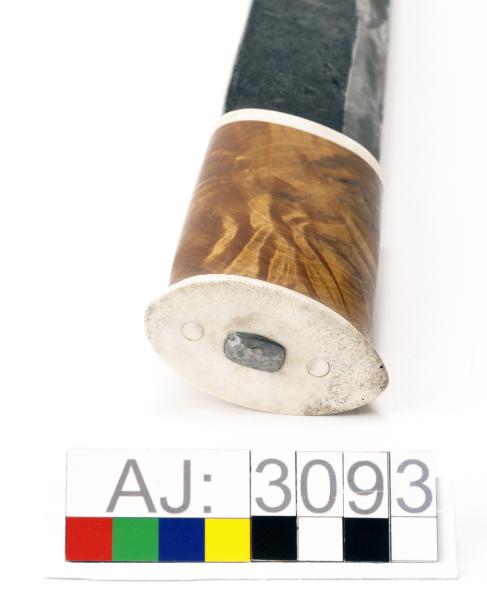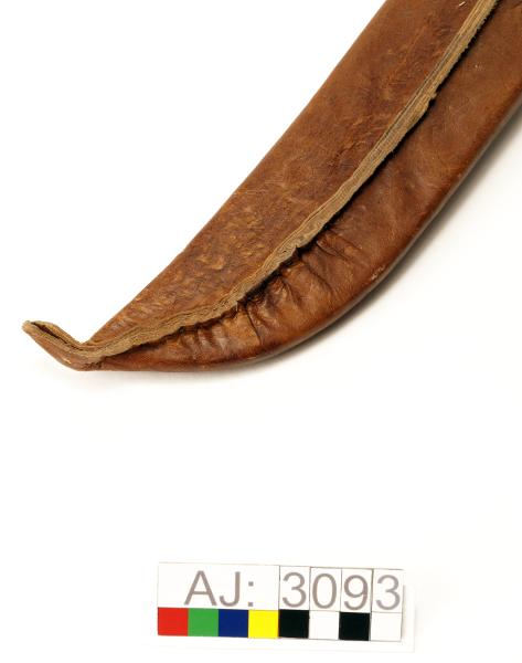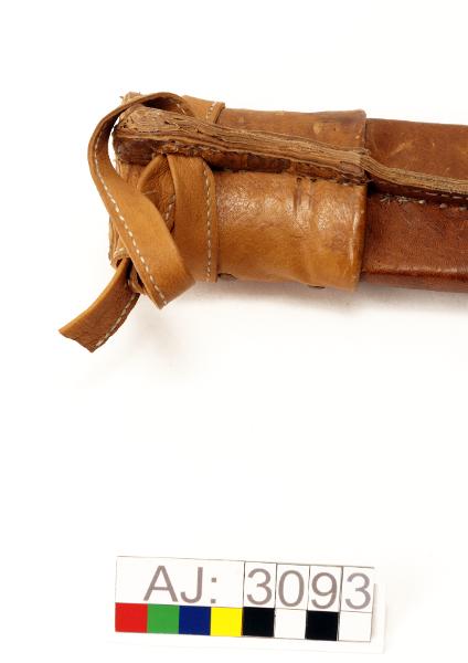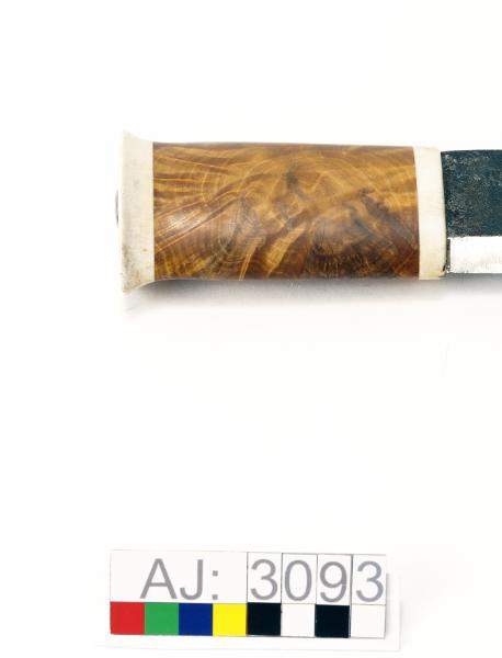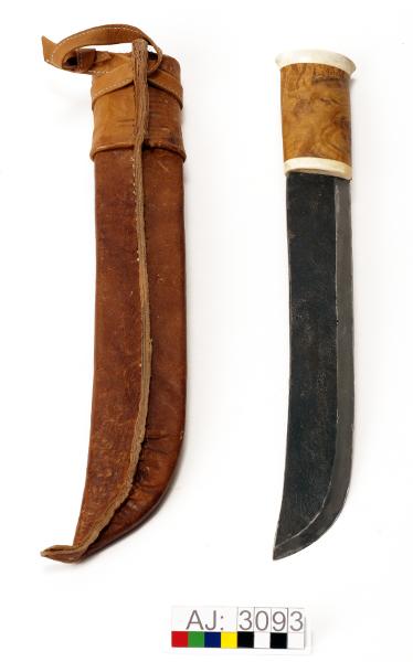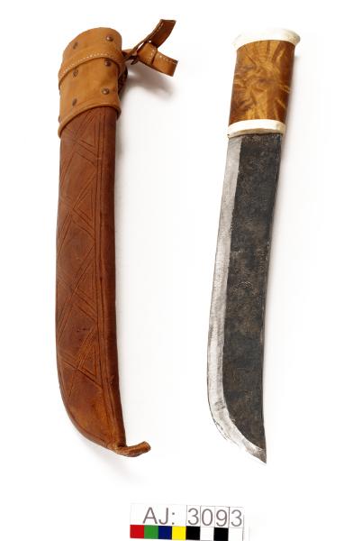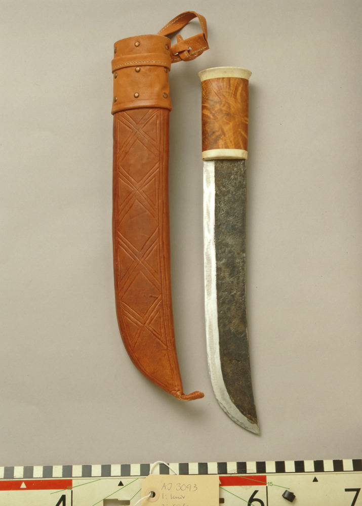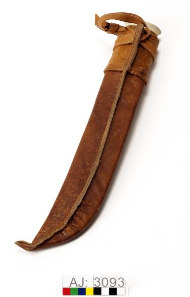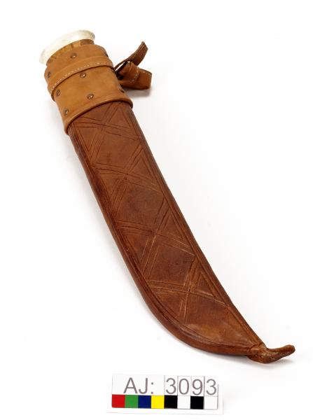 - AJ:3093:1 kniv, 2 slida. Enligt Falk kallas den för Kåtastångshuggare. Knivbladet i stål, knivskaftet i trä och horn. Högst upp på kniven syns niten. Kniv längd 40,5, bredd 6. Slidan består av en trästomme som är klädd med ljusbrunt läder som är sytt med fusksena. Lädret har ett stansade mönster på framsidan. Högst upp på slidan är det en bred remsa av läder som är faststansat med 9 stycken mässingnitar. En rem överst för fäste i bälte. Slida längd 41, bredd 7.