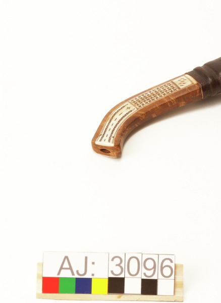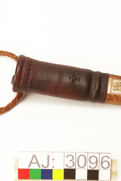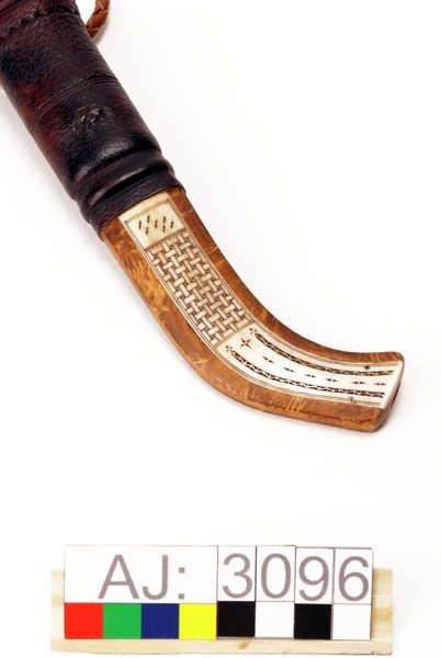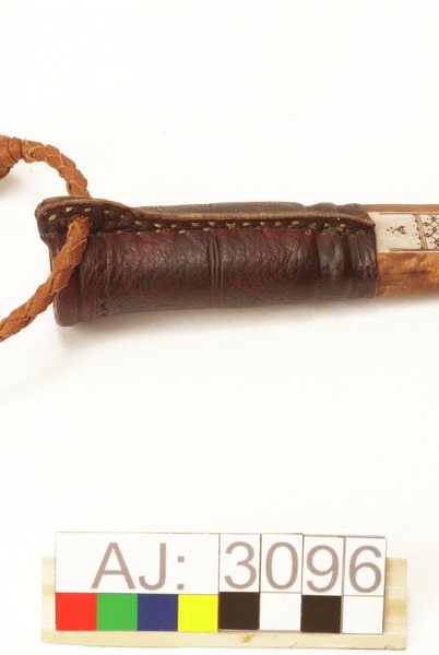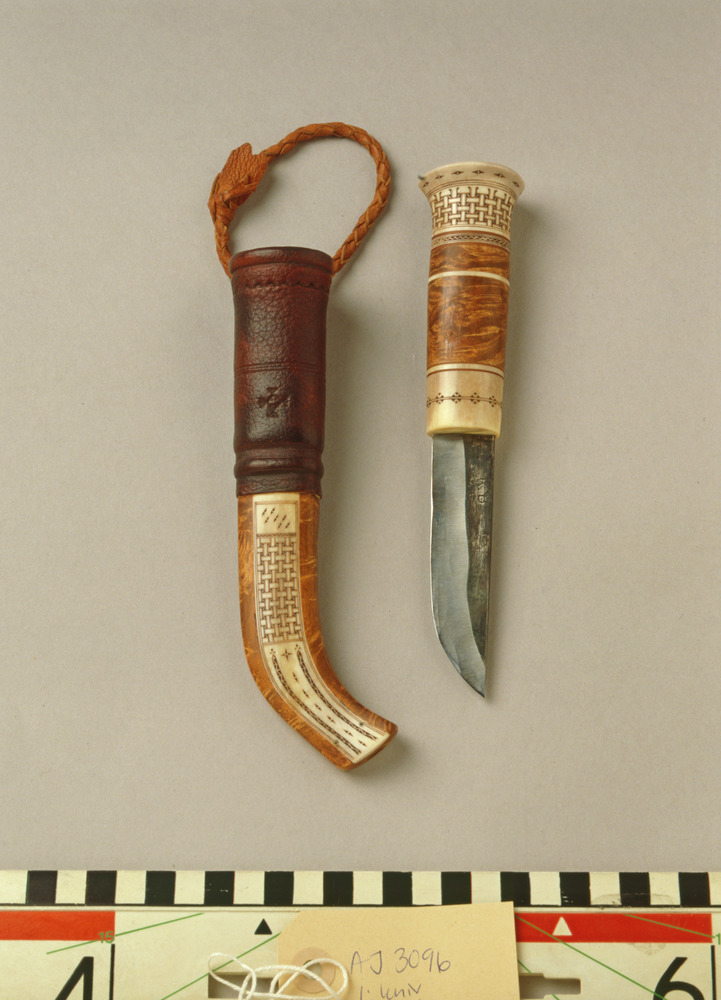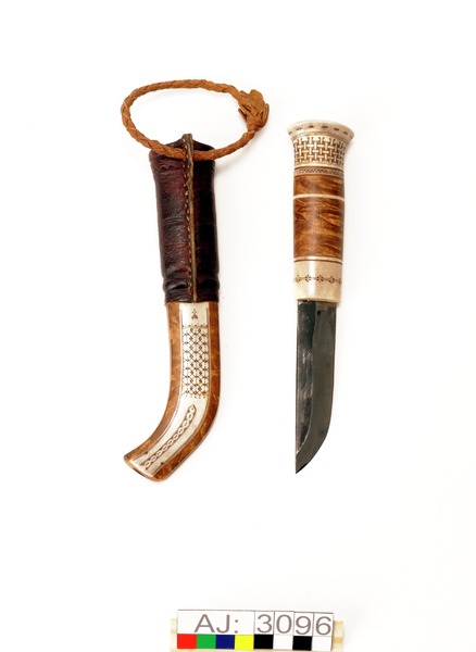 - AJ:3096:1 kniv, 2 slida. Knivbladet i stål och märkt R.B, knivskaftet i trä och horn med näver som mellanlägg. Knivskaftet är graverat. Högst upp på kniven syns niten. Kniv längd 19,5, bredd 4. Slidan består av en trästomme som har horninlägg på fram och baksidan. Dessa horninlägg är graverade, på baksidan är den märkt AA. Lädret till knivslidan har ett stansade mönster på framsidan och den är sydd med fusksena. På baksidan är den en tvinnad skinnsnodd för upphängning. Slida längd 18,5, bredd 4.