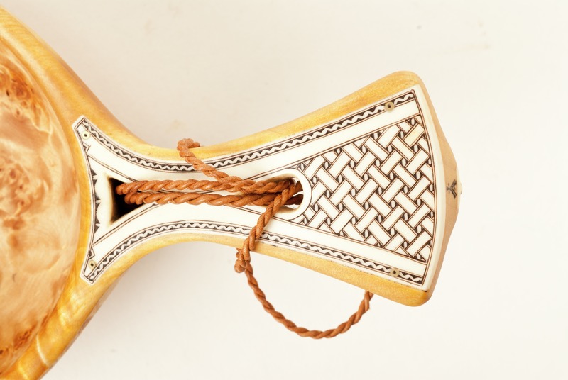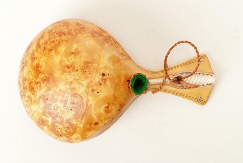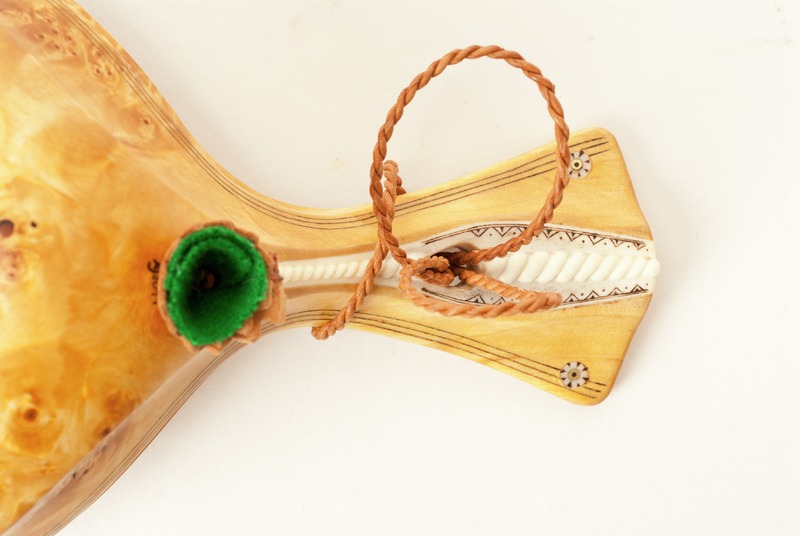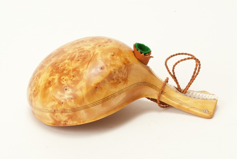 Kosa i masur i sydsamisk modell. Horninfälling på skaftets fram- och baksida samt på kosans framkant. Hornet är graverat och på undersidan är hornet reliefmönstrat. Träet på undersidan har graverade linjer. En tvinnad skinnsnodd är iträdd för upphängning. Skinnsnodden avslutas i tofs av skinn och grönt kläde. Kosan är märkt AA på kanten av skaftet.