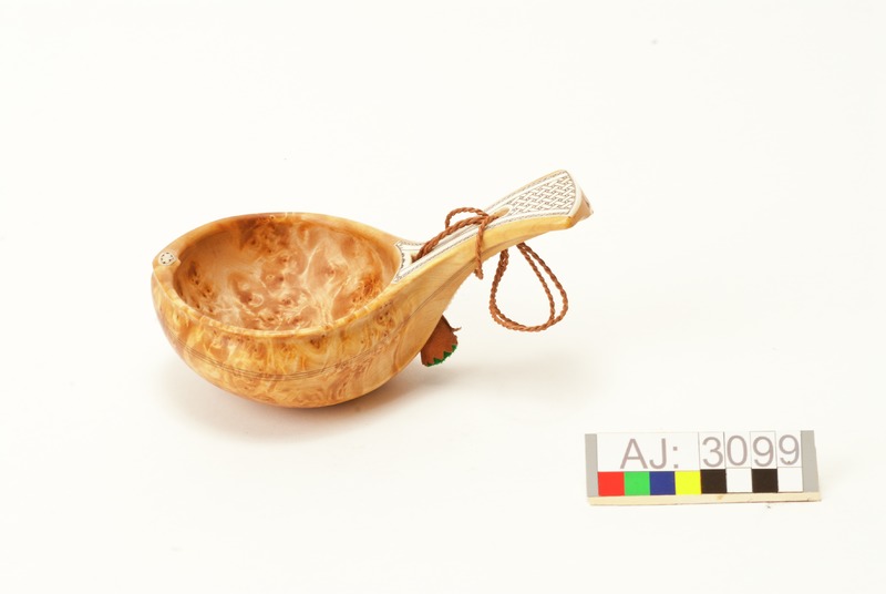 - Kosa i masur i sydsamisk modell. Horninfälling på skaftets fram- och baksida samt på kosans framkant. Hornet är graverat och på undersidan är hornet reliefmönstrat. Träet på undersidan har graverade linjer. En tvinnad skinnsnodd är iträdd för upphängning. Skinnsnodden avslutas i tofs av skinn och grönt kläde. Kosan är märkt AA på kanten av skaftet.