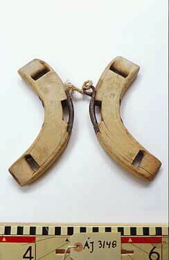 2 stycken trähandtag som är sammankopplade med ett hampasnöre. Överst är det järnbyglar. Handtagen har suttit på en postväska som man har haft i Luleluspen, Gällivare kommun.