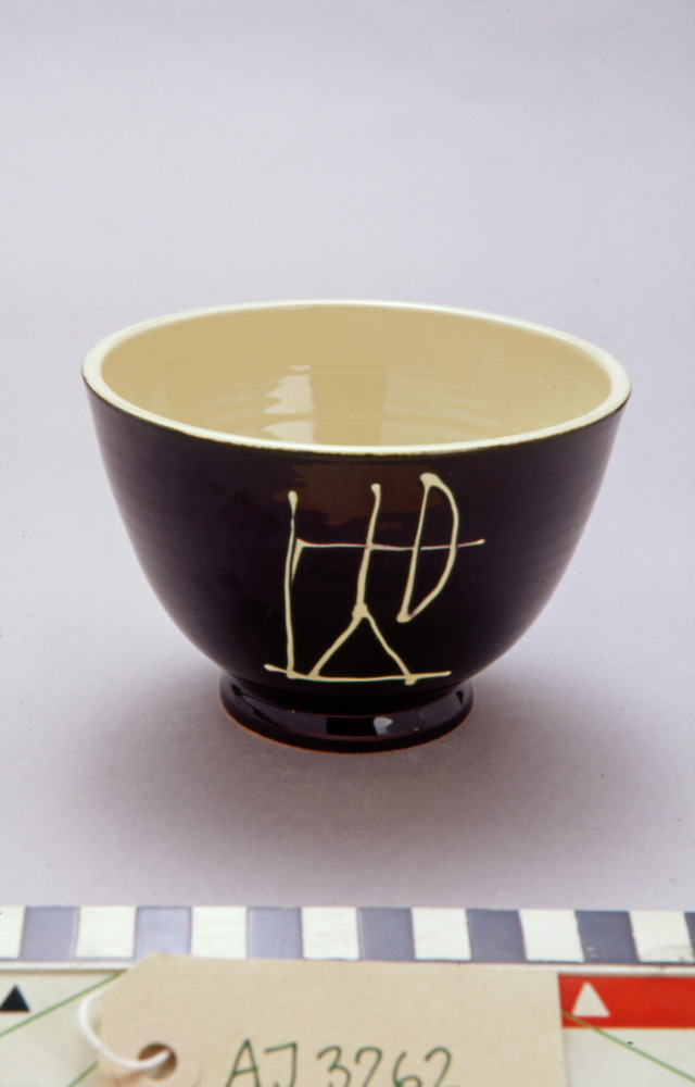 - Skål i handdrejad lera. Skålen är svartmålad på utsidan med en dekorationer i vitt på båda sidorna, två samiska runor. På insidan är skålen vitfärgad. På undersidan av skålen är det tillverkarens siganatur och det är en tryckt pappersetikett där det står: "ARRAN KRUKMAKERI www.arrankrukmakeri.com Tel. 0498-24 42 52".