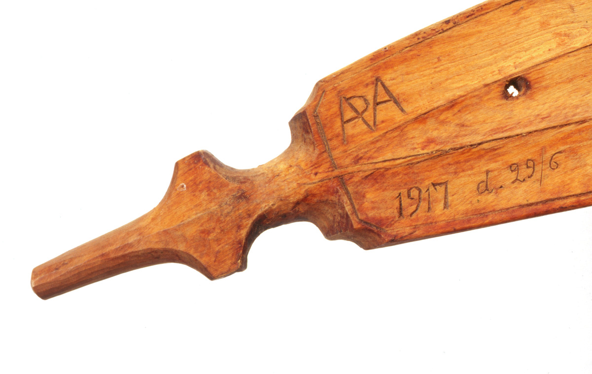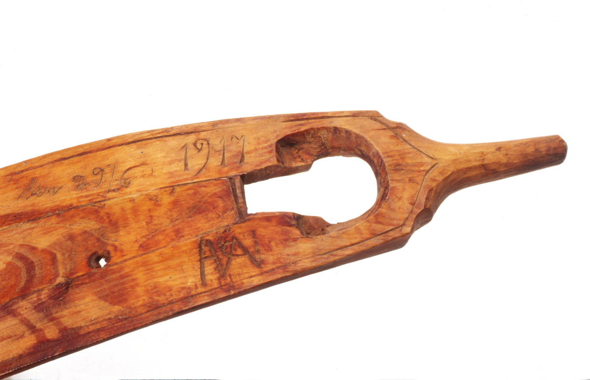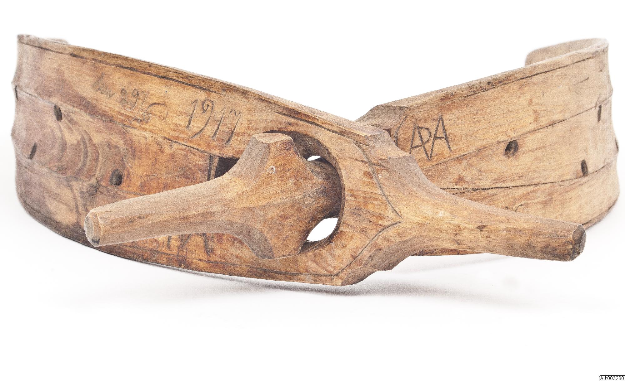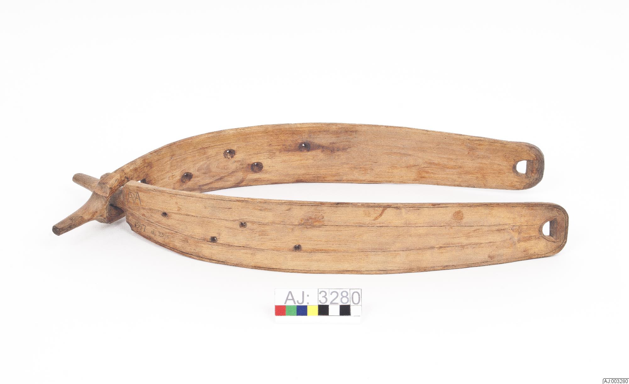 klövjesadel i två delar, av trä med inristning på ena sidan "den 29/6 1917" samt ett bomärke. På andra sidan står bomärket först och under det "1917 d.29/6".