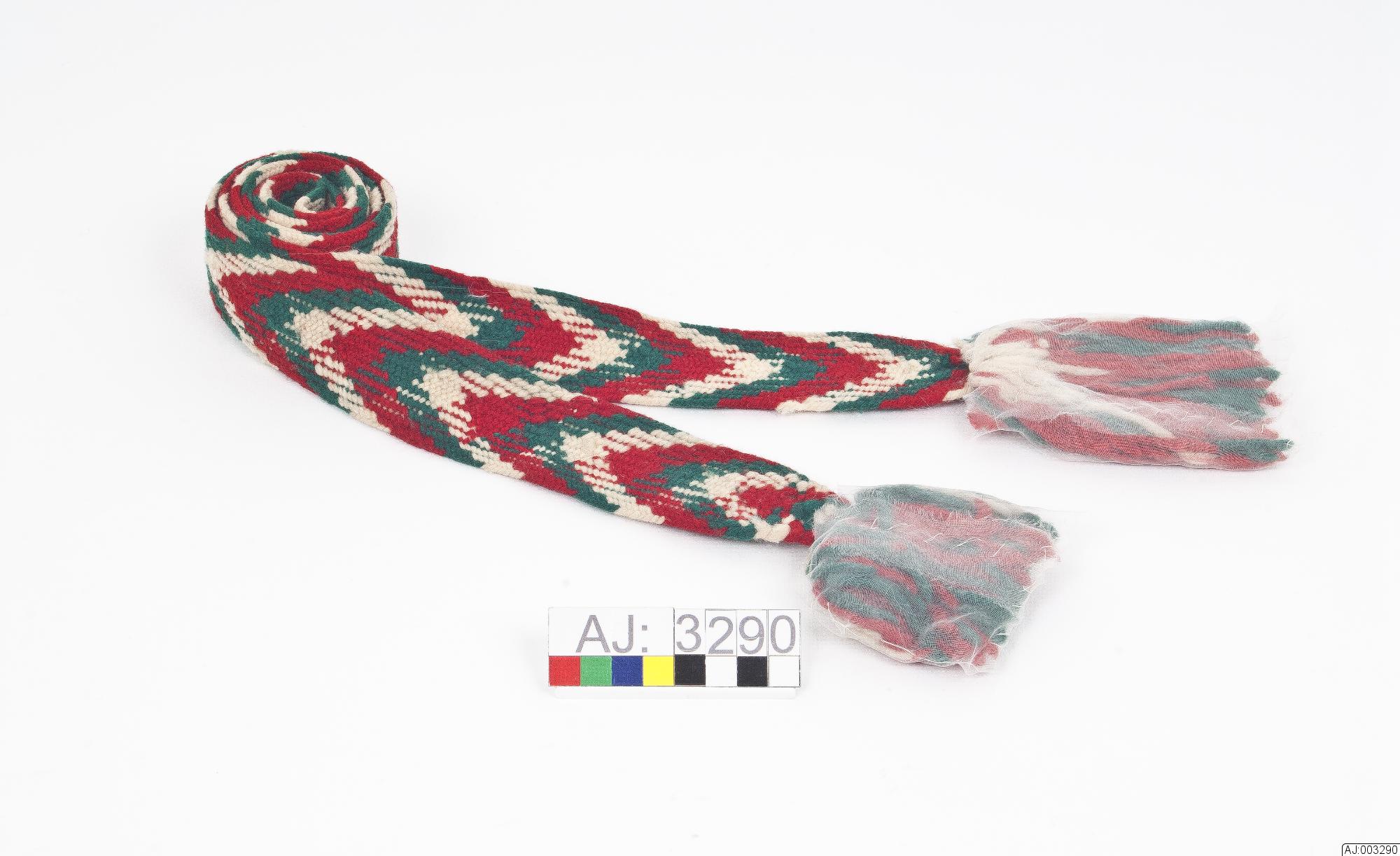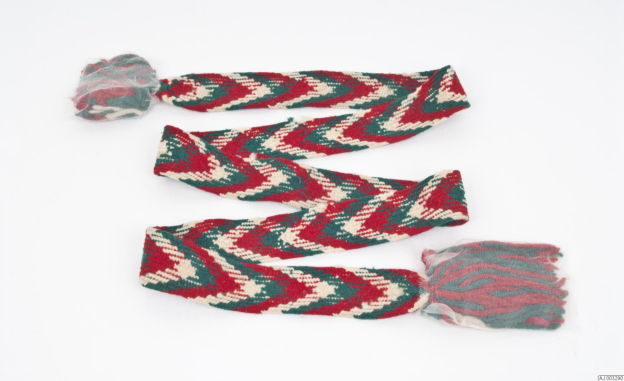 lagt band med mönster i v-form i grönt, rött samt gulvitt. Avslut av grön-röd-gulvita tofsar i bägge ändar.