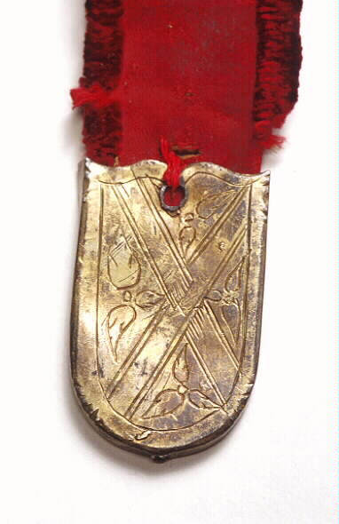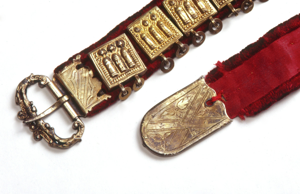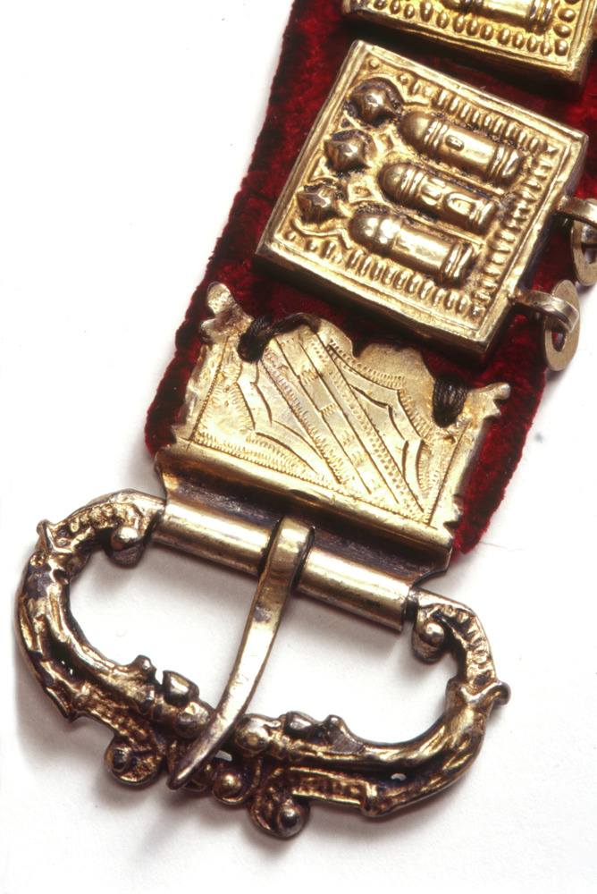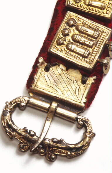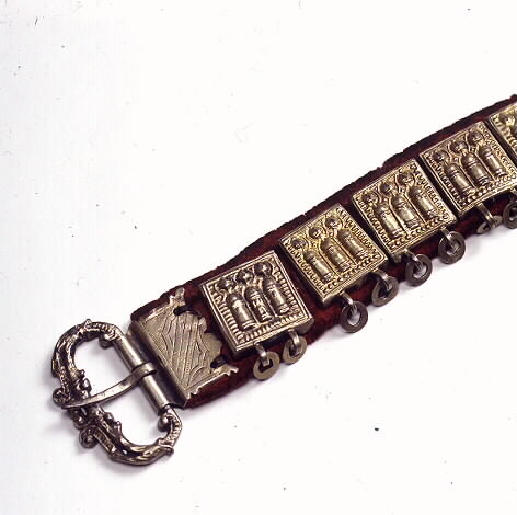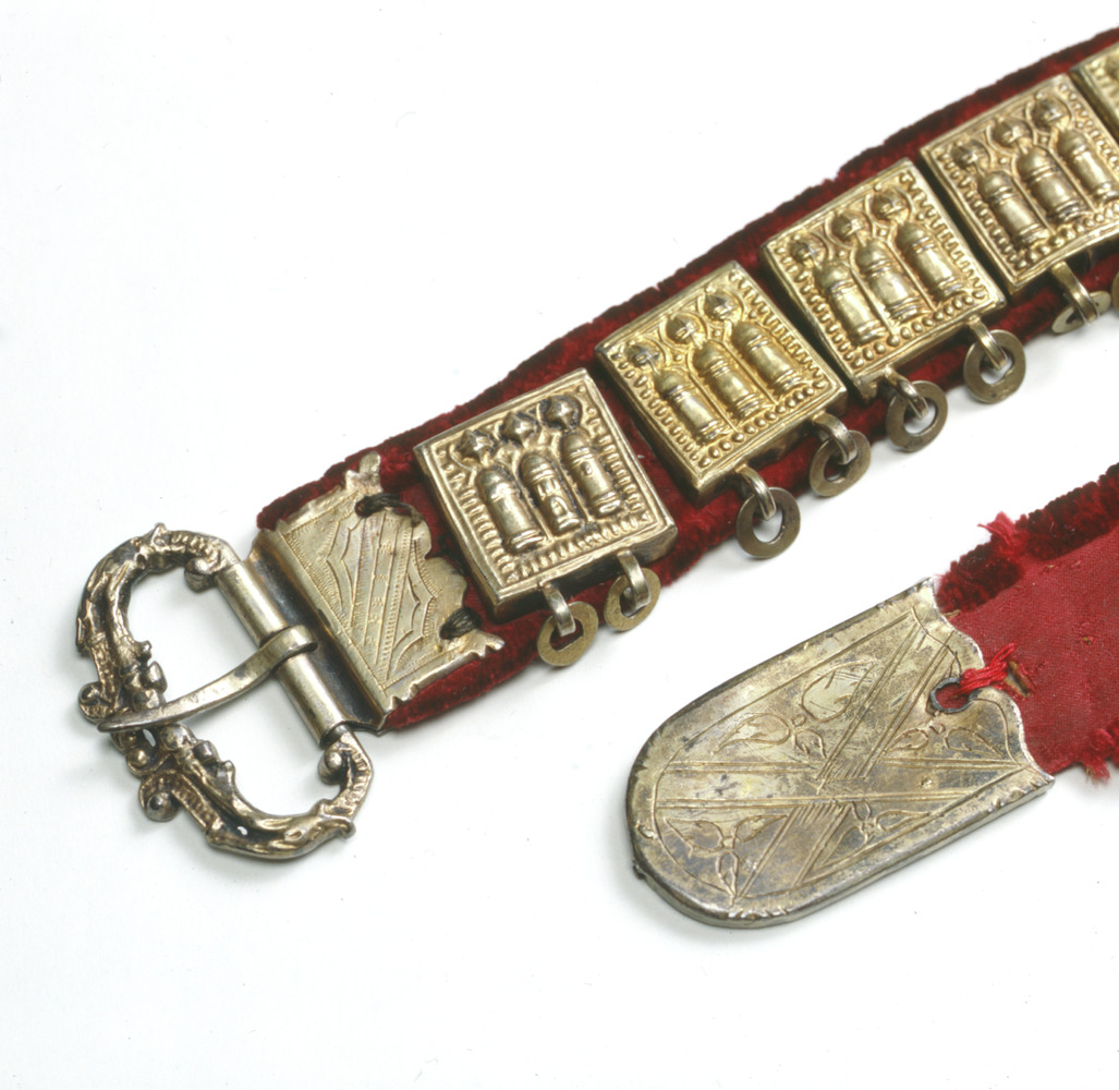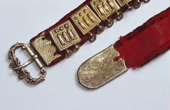 bälte av rött sidenliknande tyg med kantning av rött sammetsliknande tyg. På en del av bältets översida, ca 56 cm, är det röda sammetsliknande tyget utbytt mot ett guldbrunt i samma kvalitet. På baksidan löper en läderrem som beslagen är fästade i (beslagen har på baksidan märlor, dessa trycks igenom tyget och så träs på bältets baksida en läderrem genom märlorna).