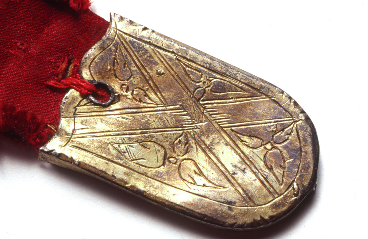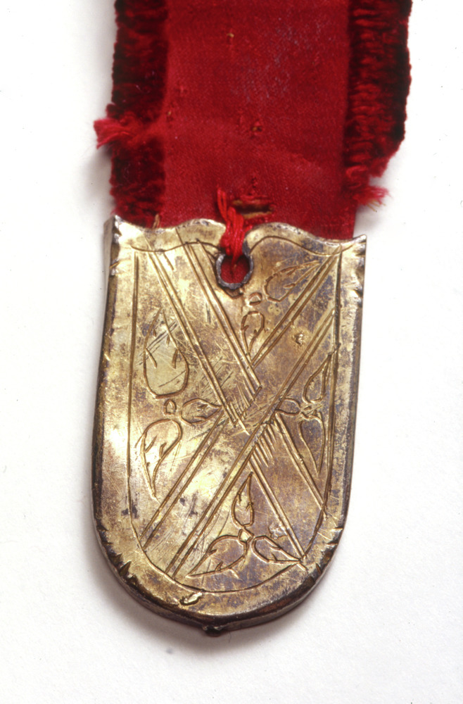 Ändbeslaget är u-format och har på framsidan dekor i form av ett kryss. I de fyra fält som krysset bildar finns löv. På ändbeslagets baksida finns inristningar - något oläsligt med skrivstil, XIII samt något som ser ut som 07.