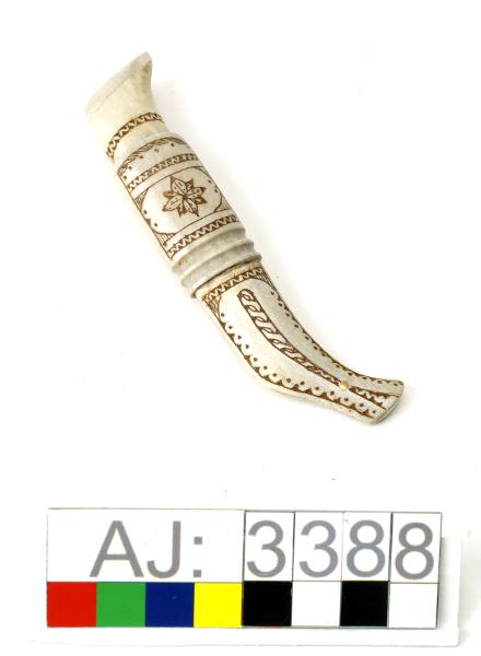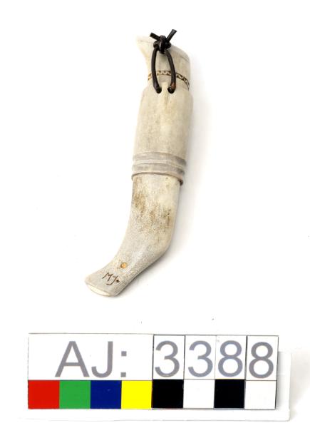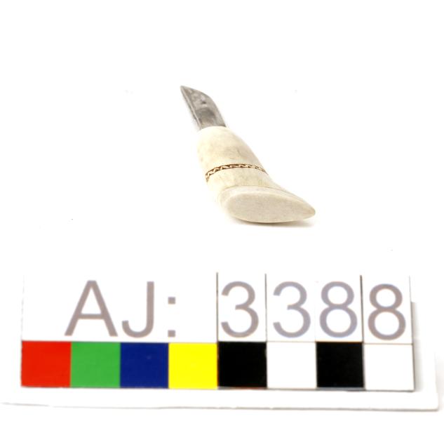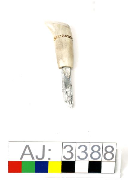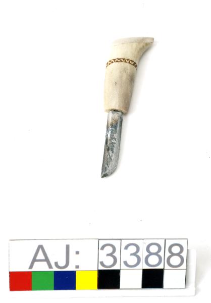 AJ 3388:1: kniv, AJ 3388:2: slida. Helhornskniv med slida, mycket liten. Slidan har en graverad framsida i bla zig-zack mönster, stjärnmönster, prickar och uddstick. Längst ner är slidan nitad med mässingsstav. Högst upp är det uttagna hål där en läderrem är iträdd för upphängning. På baksidan är slidan märkt med initialerna MJ. Kniven är graverad upptill på skaftet.