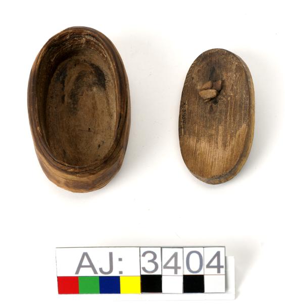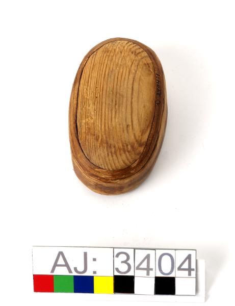 Snusdosa av trä, med lock. Dosan är svept med en separat träbotten. På undersidan är den märkt L.E.S. Locket är täljt och upptill är det i ett hål fäst en skinnremsa så att man kan dra upp locket.