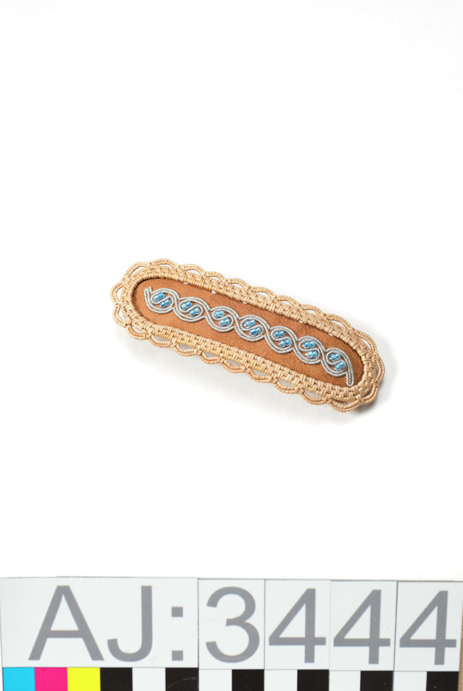 - Hårspänne av garvat renskinn som har en kant bunden av rot. Skinnet är broderat med små blå glaspärlor och tenntråd. Gjort på en hårspänne (stomme) av metall, märkt MADE IN TAIWAN.