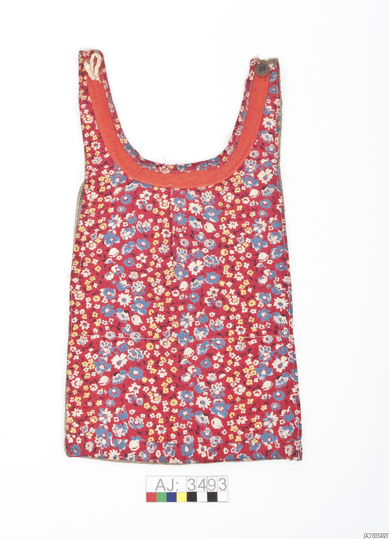 Barmkläde i blommigt tyg, röd botten med blommor i blått, gult, svart, vitt. Dekorationsbård av rött kläde, ca 1.8 cm bred. På bården är det sytt två sömmar med röd tråd. För stängning; en knapp på ena sidan och på andra sidan en ögla i vitt flätat garn. Barmklädet är fodrad i ett beiget, randigt tyg och har en öppning på ena sidan så att det blir en ficka.