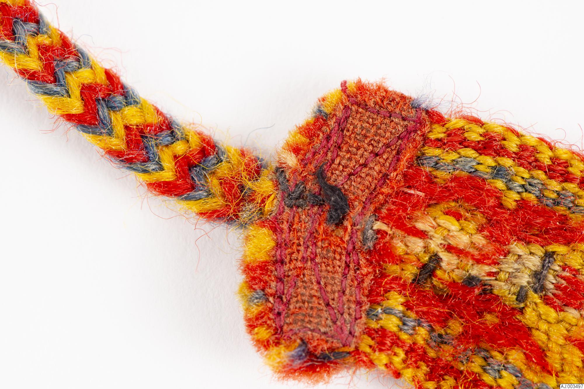 Vävda mansskoband med gul och vit botten med röda mönstertrådar. I båda ändarna är det en bit rött kläde fastsytt och i änden där skobandet är fäst i skon är det en bit av en garnfläta i färgerna rött och grönt. Detta band har gått av. Avslutningen av skobandet, där är det fäst ett smalt lagt band i rött, gult och blått. Änden har gått av. Skobandet är nött och delar av mönstertråden är borta.