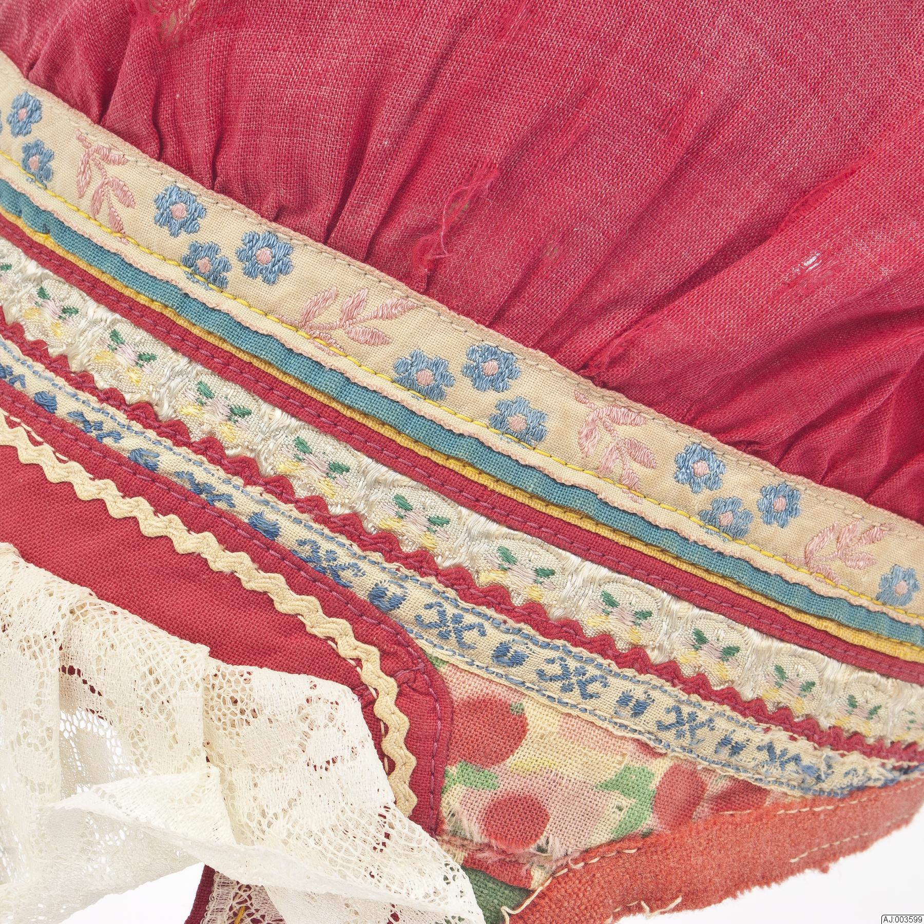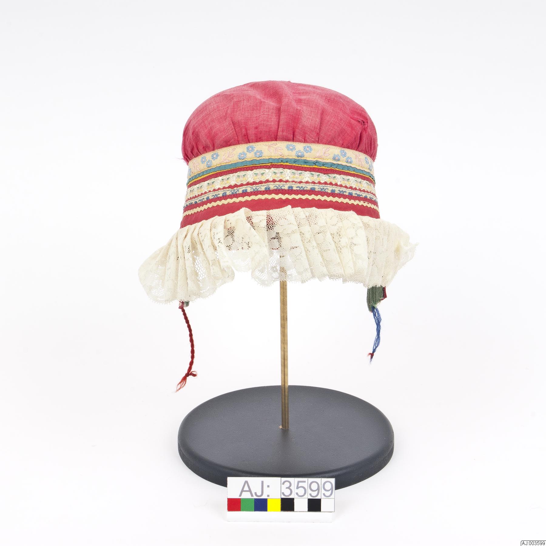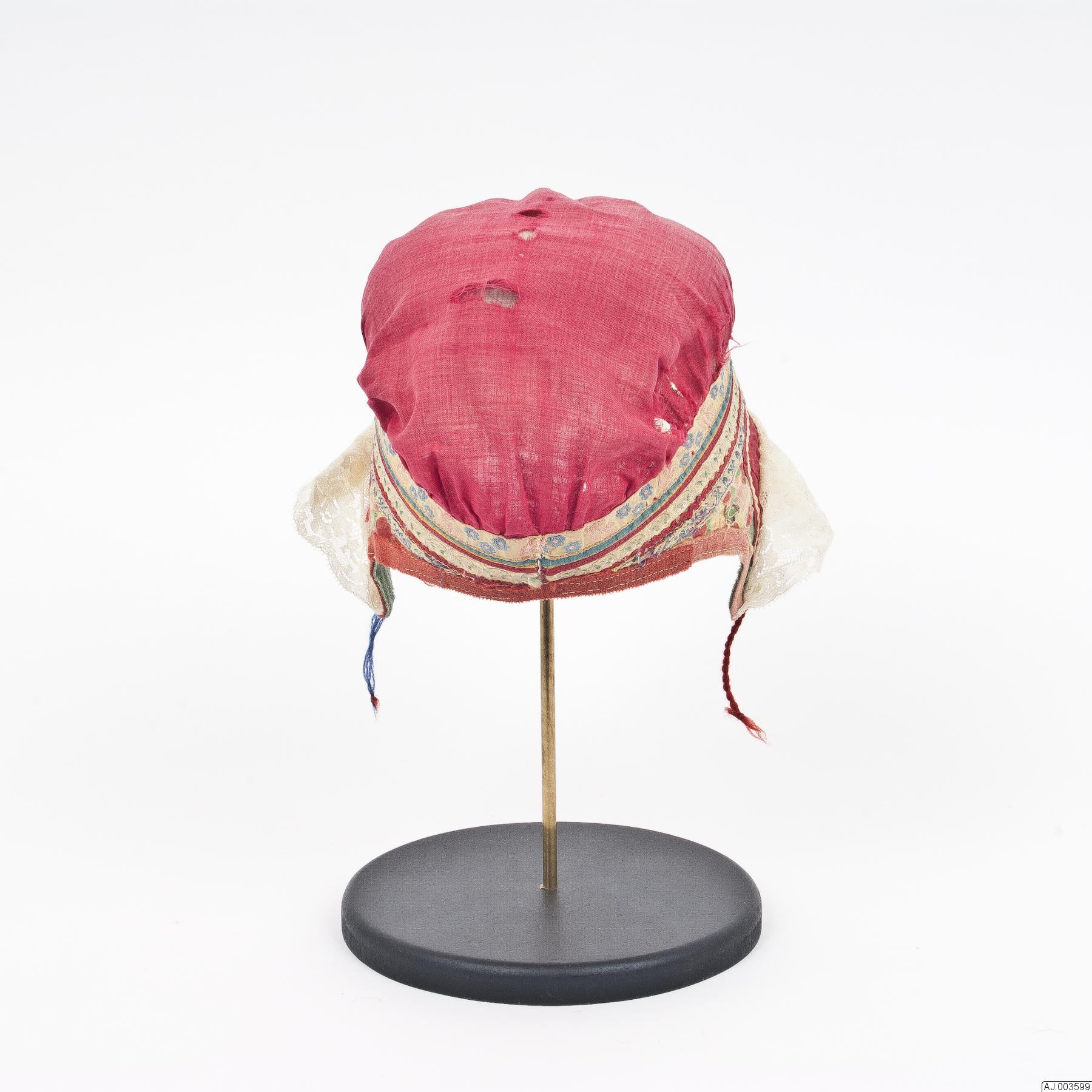 - Kvinnomössa Karesuandomodell i öronlappsmodell. Kullen, hjässpartiet, är av rött bomullstyg. Överdelen är rynkad mot mittstycket runt huvudet som är dekorerat. Först ett vitt band med blommönster i blått och rosa, 1,2 cm brett. Sedan tre smala band, ett grönt, ett gult sytt med gul tråd och ett rött band sytt med röd tråd. Sedan kommer ett blommönstrat band med vit botten och mönster i vitt, rosa, gult och grönt, detta band är 1,0 cm brett. Sedan kommer ett rött zig-zackband och ett vitt band med blått mönster sytt med vit tråd. Ned mot örat går ett stycke öronlappar och det är ett blommigt tyg först och sedan är det grönt kläde. Baktill har mössan en kantning av rött kläde sytt med vita trådar. Framtill mot ansiktet är det ett 3 cm brett rött bomullsband som går runt ansiktet, på det stycket är det sytt ett vitt zig-zackband som är sytt med vit tråd och sedan en 6 cm bred syntet? spets. Spetsen har lagts i veck i sömmen. Mössan är delvis fodrad med ett vitt bomullstyg. För stängning är det på ena sidan en blå tvinnad snodd och på andra sidan en röd tvinnad snodd. Mössa är nött och lite trasig.