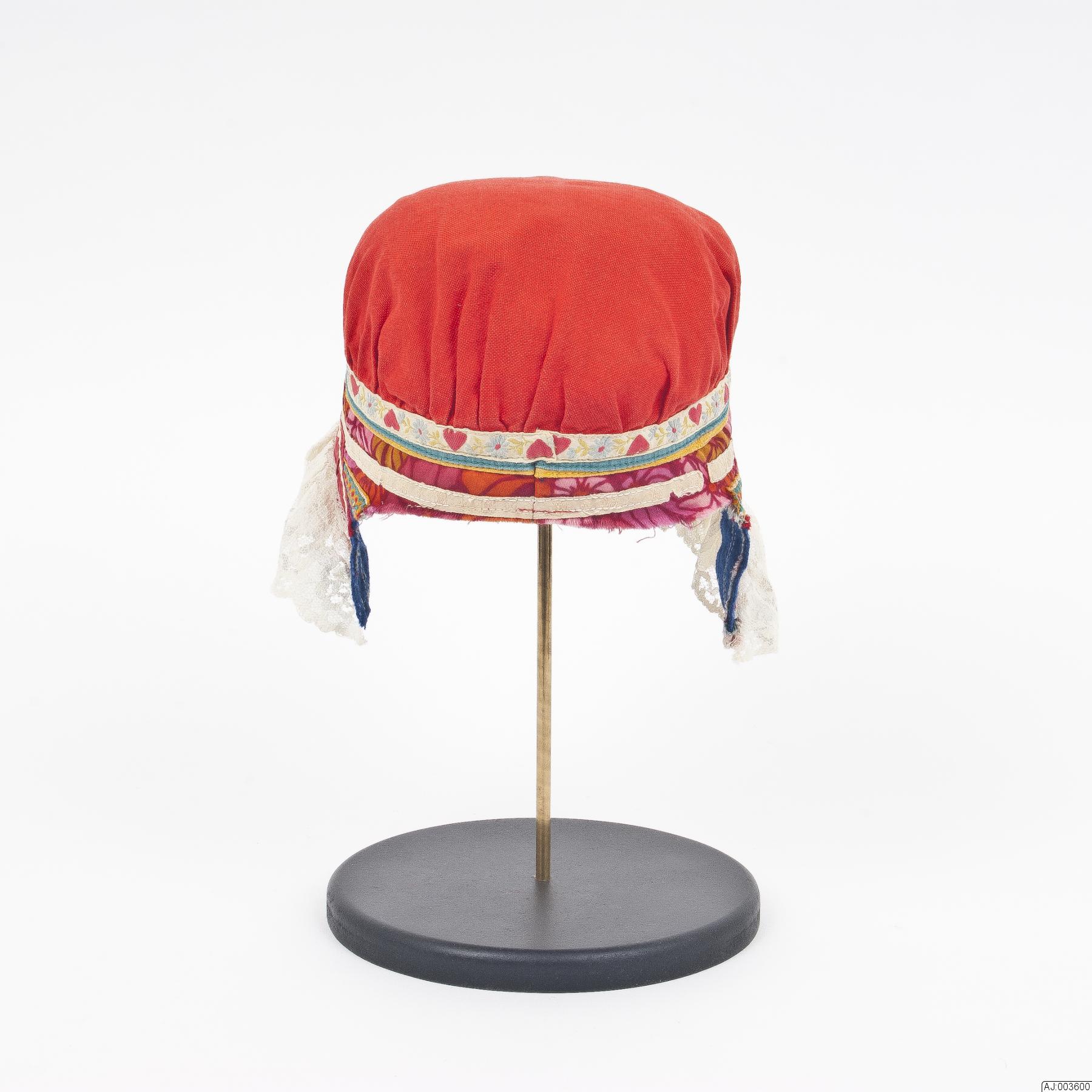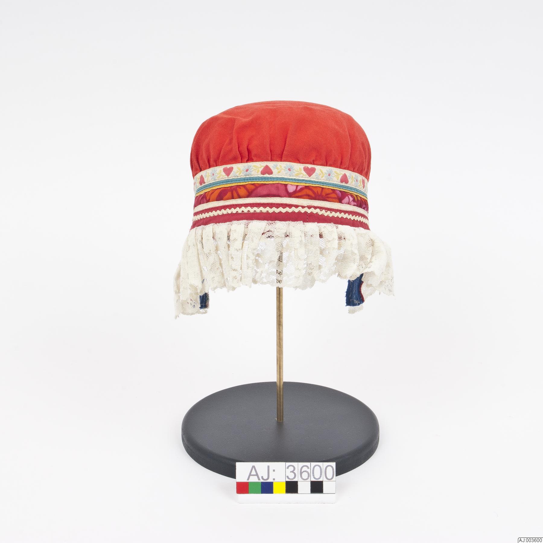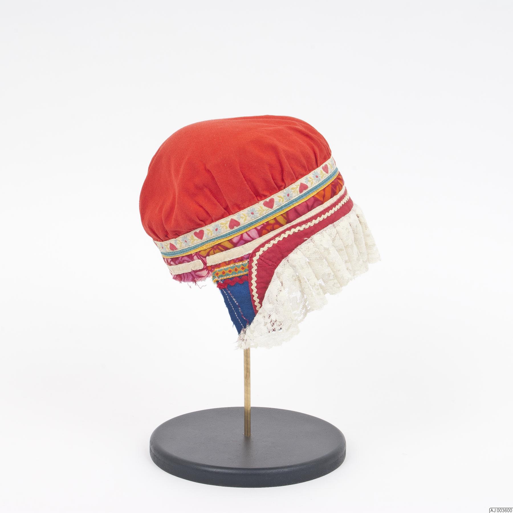 - Kvinnomössa Karesuandomodell i öronlappsmodell. Kullen, hjässpartiet, är av rött bomullstyg. Överdelen är rynkad mot mittstycket runt huvudet som är dekorerat. Först ett vitt band med blom- och hjärtmönster i blått, grönt och rosa, 1,2 cm brett. Sedan två smala band, ett grönt sytt med grön tråd, ett gult sytt med gul tråd. Sedan kommer ett blommönstrat tyg med röd botten och mönster i rosa, grönt och orange, detta band är 1,0 cm brett. Sedan kommer ett vitt band med vitt mönster sytt med vit tråd, den kommer samma blommönstrade tyg igen som ovan. Ned mot örat går ett stycke öronlappar och det är ett blommigt band i grönt, gult, rött sytt med vit tråd först och sedan är det blått kläde. På det blå klädet är det ett rött zig-zackband fäst. Baktill har mössan ingen kantning då den nötts bort. Framtill mot ansiktet är det ett 3 cm brett rött bomullsband som går runt ansiktet, på det stycket är det sytt ett vitt zig-zackband som är sytt med vit tråd och sedan en 6 cm bred syntet? spets. Spetsen har lagts i veck i sömmen. Mössan är delvis fodrad med ett blått mönstrat bomullstyg. Mössa är nött och lite trasig.