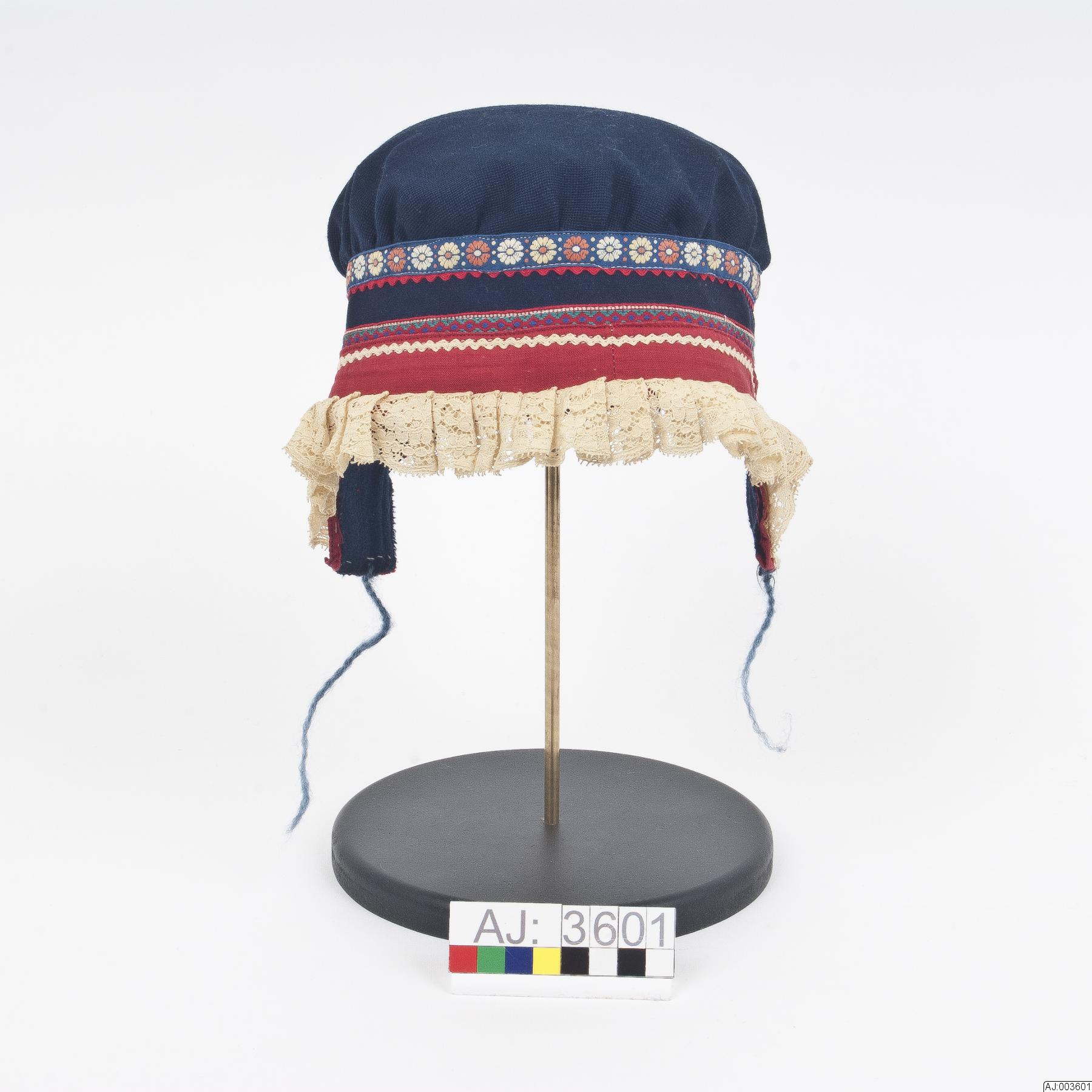 Kvinnomössa Karesuandomodell i öronlappsmodell. Kullen, hjässpartiet, är av blått bomullstyg. Överdelen är rynkad mot mittstycket runt huvudet som är dekorerat. Först ett blått band med blommönster i vitt och orange, 1,2 cm brett. Sedan ett rött zig-zackband. Sedan kommer blått tyg. Sedan kommer ett mönstrat band i rött, blått, grönt och vitt. Ned mot örat går ett stycke öronlappar och det är ett blommigt tyg i blått, grönt, rosa, rött och vitt sytt med vit tråd först och sedan är det blått kläde. Baktill har mössan en kantning av rött kläde sytt med två vita sömmar. Framtill mot ansiktet är det ett 3 cm brett rött bomullsband som går runt ansiktet, på det stycket är det sytt ett vitt zig-zackband som är sytt med vit tråd och sedan en 3 cm bred syntet? spets. Spetsen har lagts i veck i sömmen. Mössan är delvis fodrad med ett svart tyg. För stängning är det en blå tvinnad snodd fäst på var sida. Mössa är nött och lite trasig.