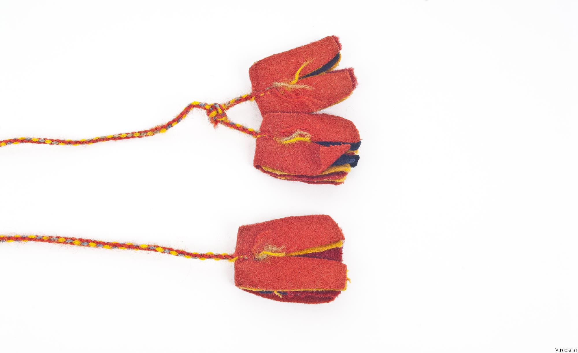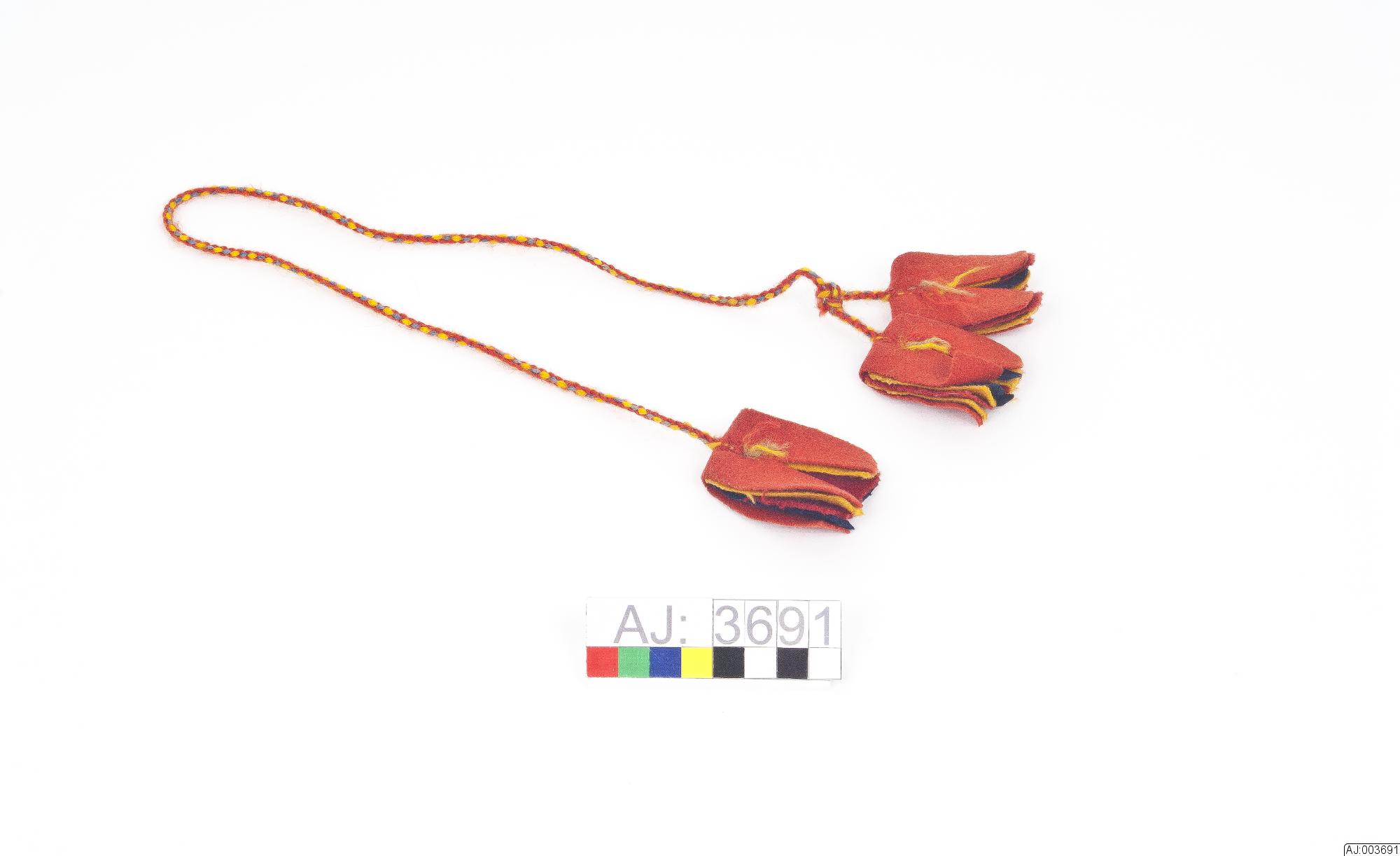 AJ 3691:1, ett 4-flätat band med 2 röda, 1 blå och 1 gul tråd. I båda ändarna är det en klädestofs i rött, gult och blått kläde. L 72 B 4.