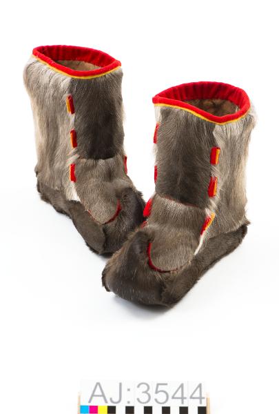 Skor av hemberedda höstbällingar med näbb och skaft. Inåtvända sömmar. Skoskaftens öppning kantade med rött och gult kläde. I sömmarna vid hälen och runt ovanlädret är en röd klädespasspoal inlagd och i skoskaftets sömmar framtill klippta bitar av rött och gult kläde. Skorna är skurna efter traditionellt snitt, se Jannok Porsbo, Susanna: Samiskt dräktskick (1989), men utan öglor för skoband.