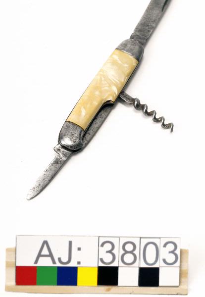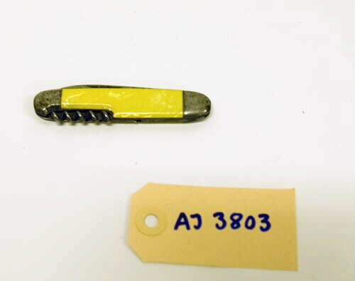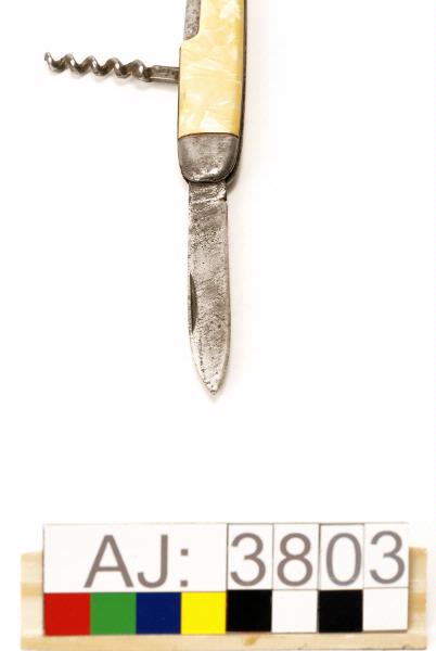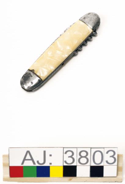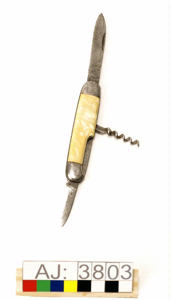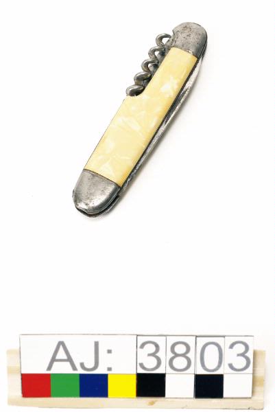 En fällkniv i metall med beslag i gulaktig plast?