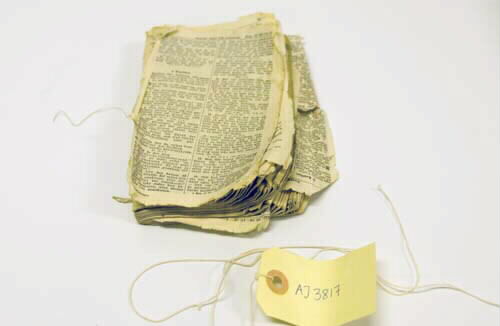 Del av. En del av bibeln, pärmen är borta och en del blad är lösa.