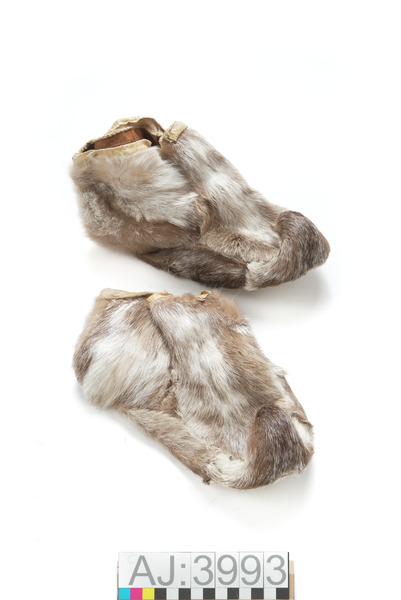 Ett par bällingskor sydda av ljusbruna vinterbällingar med lite fläckar på. Upptill på skaften är det en dragsko i vitt skinn, dragskoremmarna saknas. Skorna är slitna och lite trasiga på undersidan.