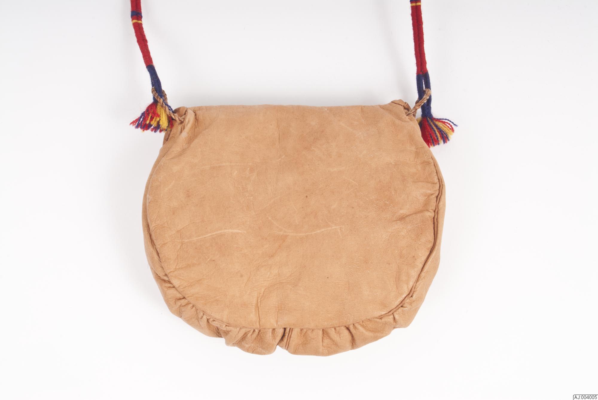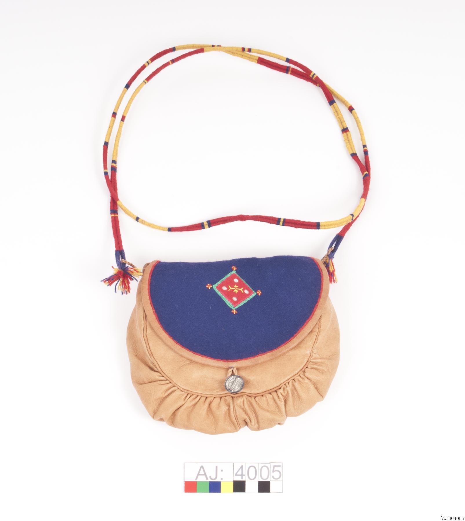 - Väska av renskinn med lock. Locket av mörkblått kläde med mönster: röd fyrkant av kläde som har fyra runda hål på, innanför hålen syns glimret. Den röda klädesbiten är fastsytt med tät sicksack med grönt garn. vid varje hörn av den röda fyrkant är de röda urklippta rundlarna fastsydda med ett kryss av gult garn. Rund silverknapp att stänga locket med. Axelrem av vävgarn tätt lindat kring två remmar, som lulesamiska hängande bälteprydnader. Liten tofs i var ände av axelremmen.