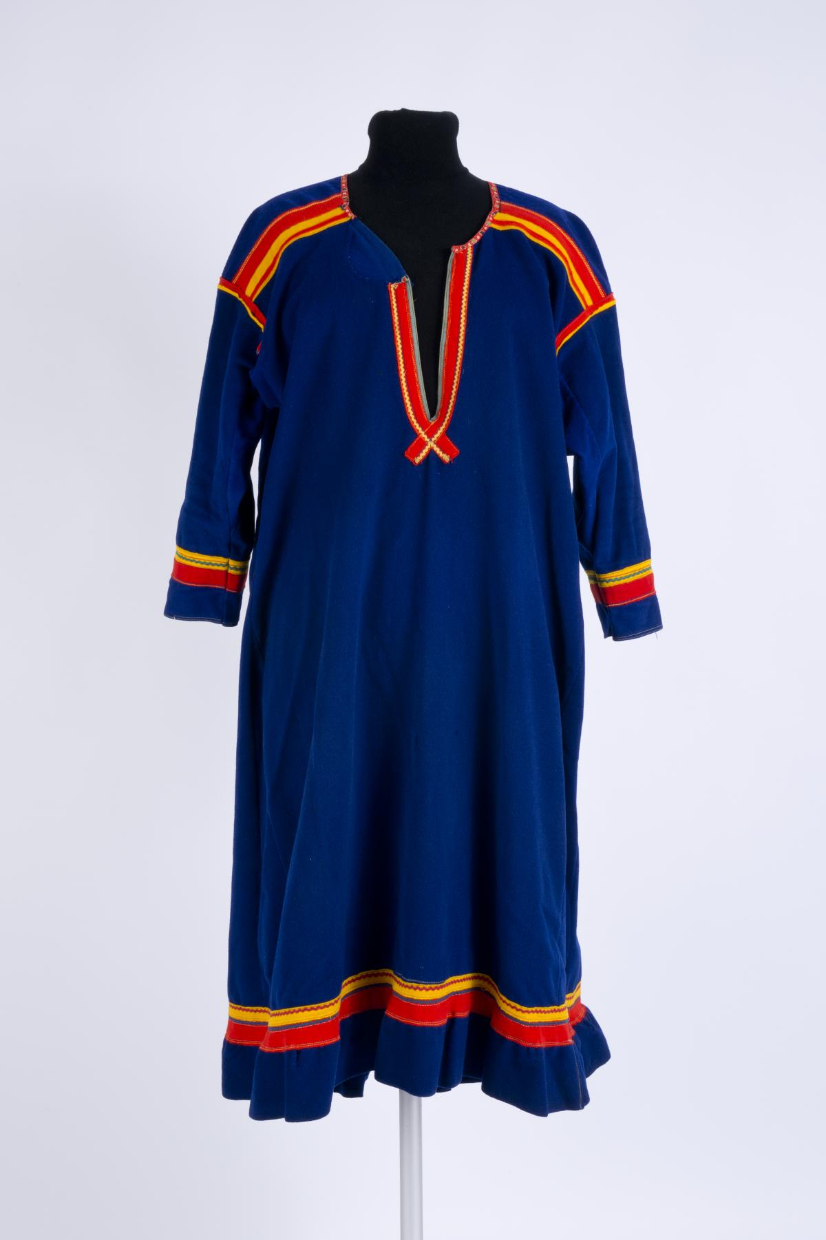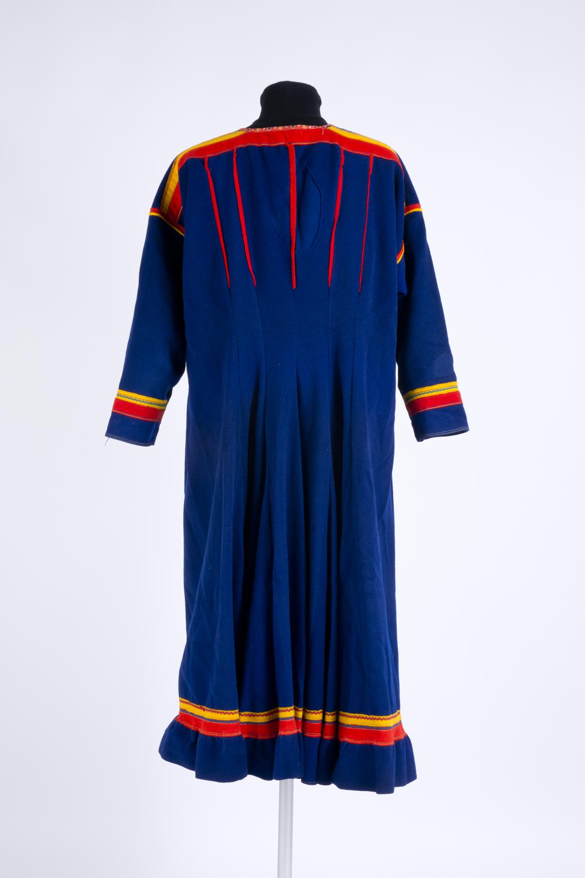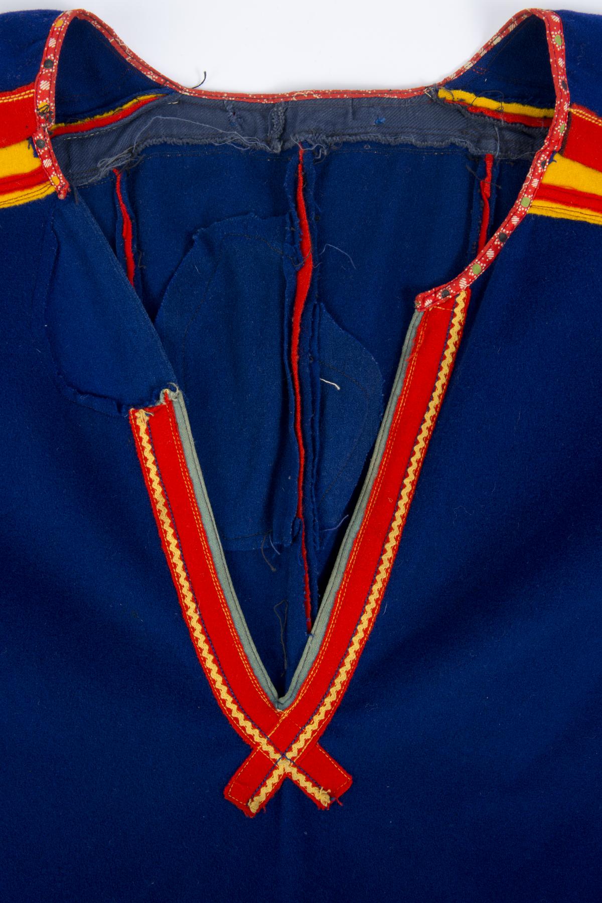 Kvinnokolt i Karesuandomodell. Sydd av blått kläde. Ovddabealli/framstycke. Kolten har ok över axlarna. I sömmen i ryggen i avigan är ett bomullstyg lagt in som förstärkning över sömmen mellan ok och bakstycken. Sealgebealli/bakstycket består av sex våder, olli, och fyra kilar, gáidá, från midjan och neråt. Varje kil har en extrakil inlaggt på ena sidan. fem röda klädesremsor i sömmarna mellan ryggvåderna. Kolten är dekorerad med rött och gult kläde och röda och blå sicksackband och raksömmar i avvikande färger. I var sida: en kil från ärm till fåll. Kolten kortare fram än bak. I v-ringningen röd klädesbård lagd i kors mitt fram, dekorerad med gula sicksack-band. V-ringningen kantad med grönt tyg. Halsringningen kantad med blommigt band. I sömmen mellan kolt och ärm klädesremsor av gult och rött kläde. Holbin, koltens nederdel, består av stadigkanten av det blå klädet, x cm bred. Den är rynkad som en volang mot kolten. Kantad i överkant med gult och rött kläde med rött och blått sicksack-band.