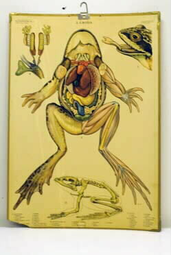 En skolplansch som heter groda. Planschen är gjord av kraftigt papperskartong med en tryckt framsidan och upptill är det en hängare i metall.