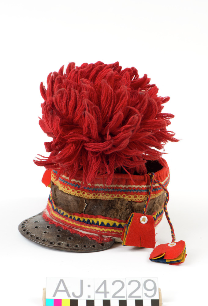 Manmössa, čuipi, med pälsbräm (viergegahpir ) och läderskärm. Brämmössa av blått kläde och brämet av mörkbrun kalvhärna. Buddejuvvon jievjagabmasijn, kantad med vit bälling. 10 kilar, biehtana, med röda och gula klädesremsor i sömmarna. Rukses diehppi, röd tofs. Garnering med klädesremsor, hervejuvvon laddidearrasat. Alit njunjesuorranat, blå uddklippt klädesremsa. Även garnerad med sicksackband, mohkkebattit, och gul spetsremsa. Dragsko av rundflätad band, ruvdabaddi, ( 8 trådar) med klädestofsar i färgerna rött, gult och blått. Varje tofs är dekorerad med 2 vita knappar. Galba riehtis hervejuvvon rieggaiguin, skärm av läder dekorerad med märlor. Skärmen fastsytt med rött ullgarn.