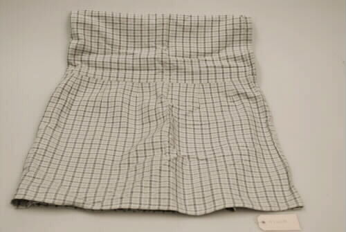 - En avlång rutigt sängöverkast som är ljusblått med mönster i mörkare blått och vitt. Överkastet består av en längd som är ihopsydd med en veckad kappa längst ena långsidan. Alla sidorna är fållade på maskin. Gardinen är lite urtvättad, fläckig och den har blivit lagad på maskin.