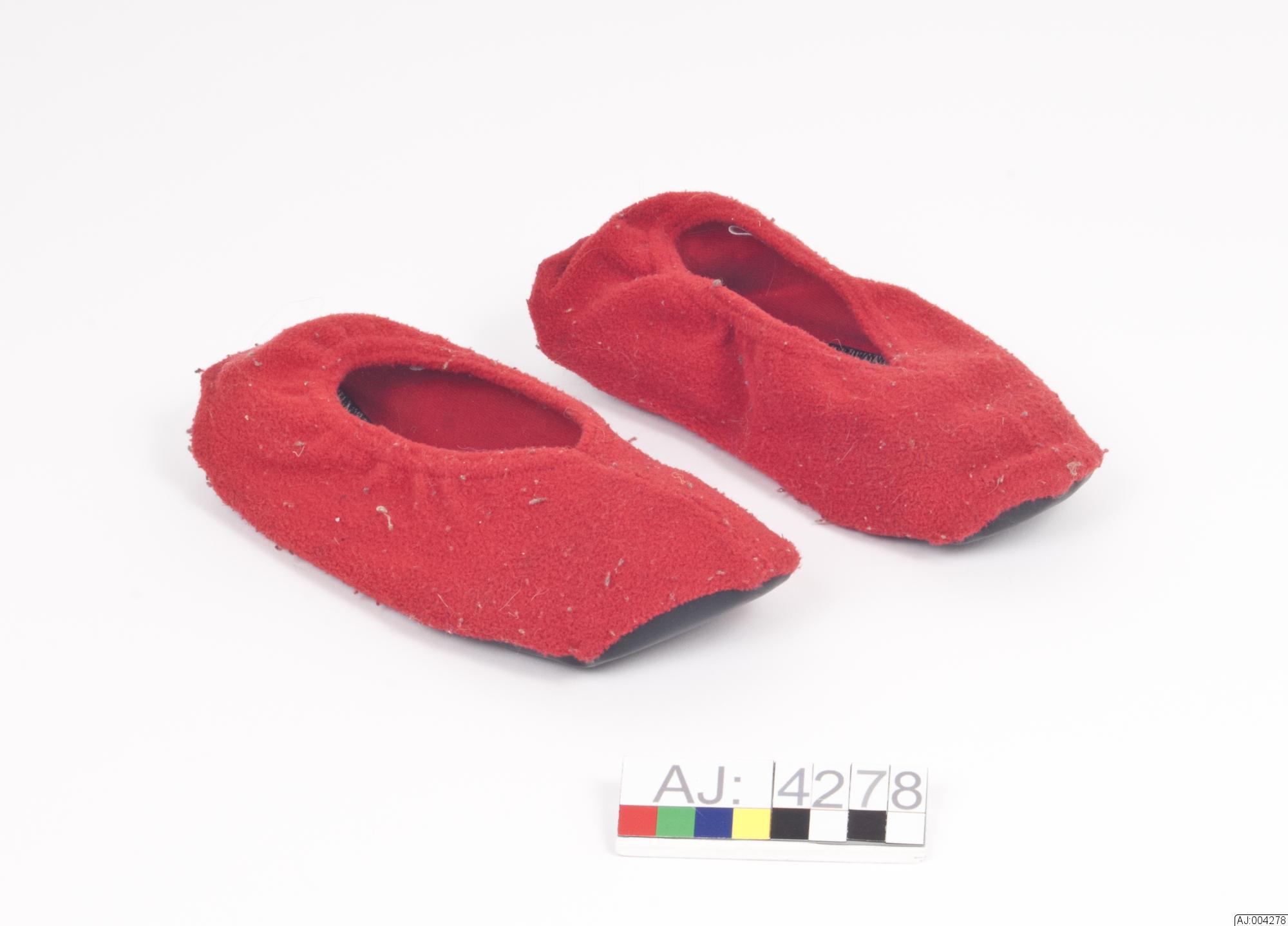 Ett par tofflor i rött tyg med en fastsydd svart gummibotten. Ett gummiband spänner åt upptill så att tofflorna sitter fast. Tofflorna är i barnstorlek.