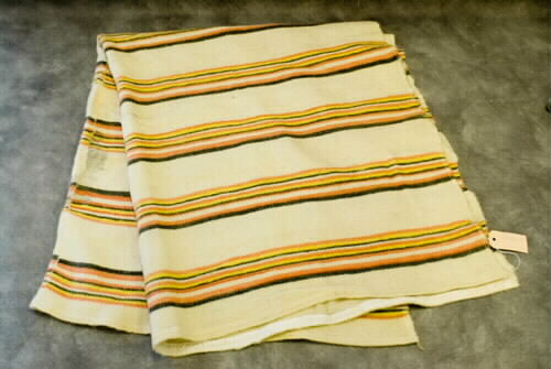 - En rana som har fungerat som täcke?. Ranan är vävd, eventuellt på en vävstol, i två längder som är ihopsydda på var sin långsida så det blir en bredare rana. Ihopsömnaden av de bägge längderna är gjord för hand och med ett grovt garn. Grundfärgen är vit med ränder i rött, gult, vitt och grått eller brunt. På båda kortsidorna är ranan kantad på undersidan med en bit vitt tyg som är fastsytt på maskin med vit tråd. Längst långsidorna är ranan sydd med en raksöm på maskin. Ranan har några hål, är lite fläckig och har lagats. Färgerna är blekta.
