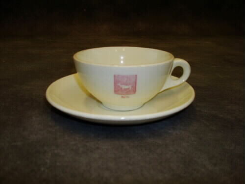 En tekopp och fat i vit porslin. På koppen är det tryckt i röd färg ett märke med en ren och under den är det initialerna NS tryckt. Samma tryck finns på fatet. Under fatet är det tryckt i ljusgrönt (nästan som guld) NK GUSTAVSBERG BEN PORSLIN 147 B1.
