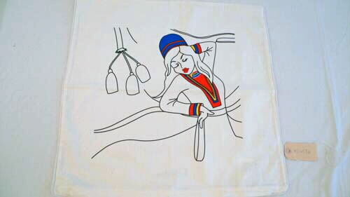 Ett kuddfodral i vitt tyg med tryck på. Kuddfodralet är industritillverkat och Ann-Sofie har tryckt på framsidan i svart färg. Det är en kvinna i lulesamisk kolt, vissa av koltdetaljerna är färglagda i rött, blått, gult och grönt. I övrigt är det ändan av ett lulesamiskt bälte i svart/vitt. På baksidan är det tryckt "Ann-Sofie AS Jonsson" längst ner på kudden.
