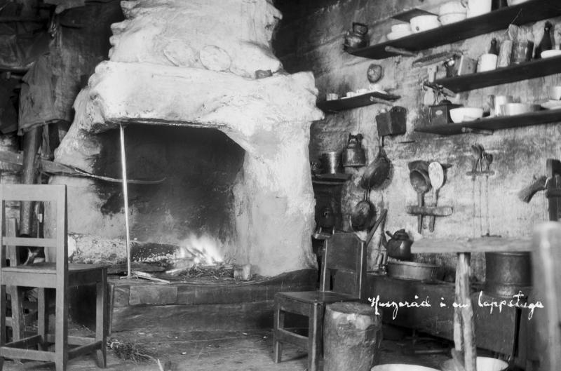 interiör i en stuga. Kök med husgeråd.