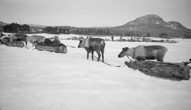 Renrajd genom byn Njavve. Berget i bagrunden är Tjärggo.