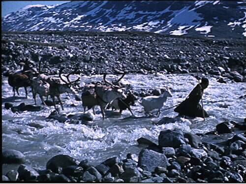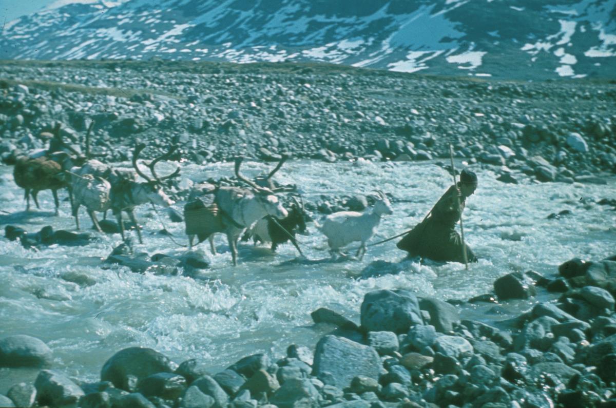 1990:11:00106:D :: klövjerajd, renhjord, älv, vadställe, kvinna, get, fjällvärld, flyttning