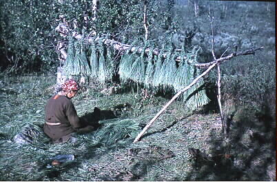Kvinna flätar bilgá/skohöflätor. I Tjåhke, Sijddojávrre 1945.