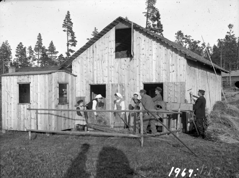 jordbruksarbete; tröskning; folksamling; magasin