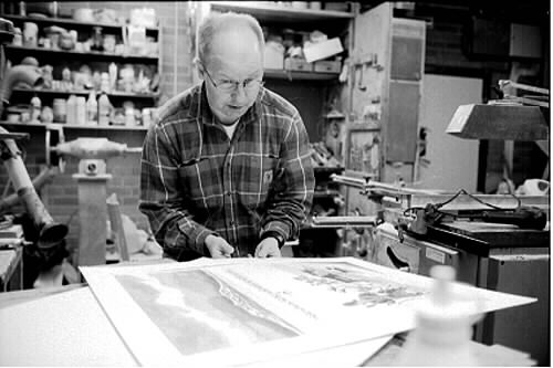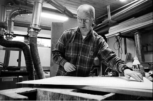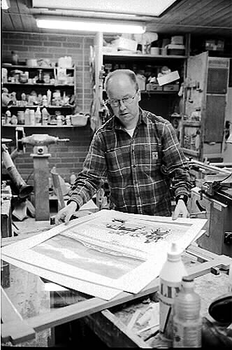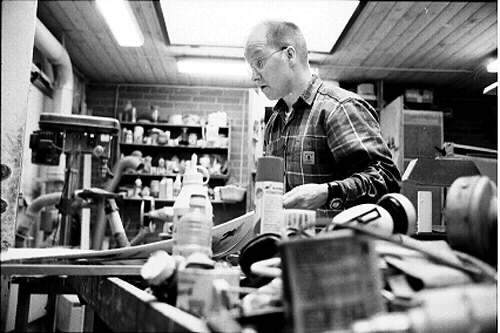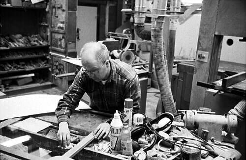 man jobbar med att rama in ett av faderns verk. Han tillverkar även ramen. Arbetet sker i snickeriverkstan hemma hosfaderb.